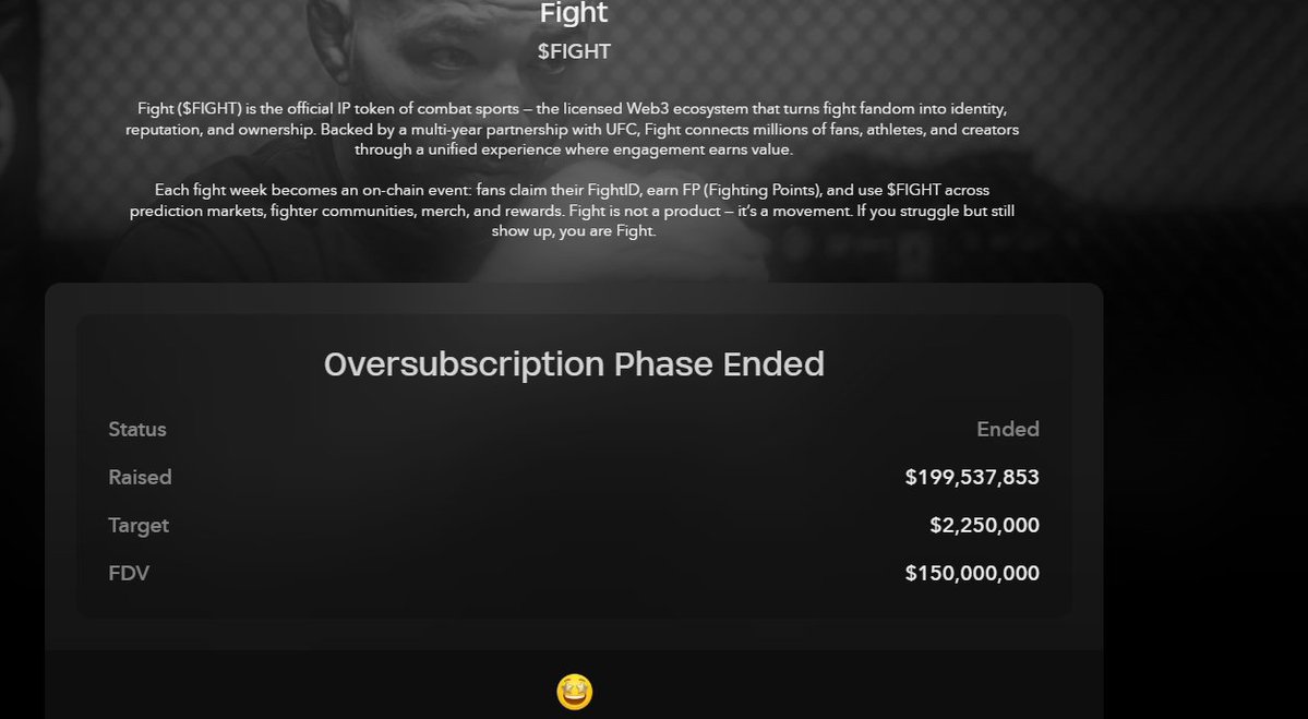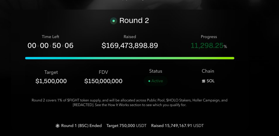 说出来你们可能不信 $FIGHT 二期原本就打算募150万美元,结果超了122倍,最后硬生生收了1.83亿美金