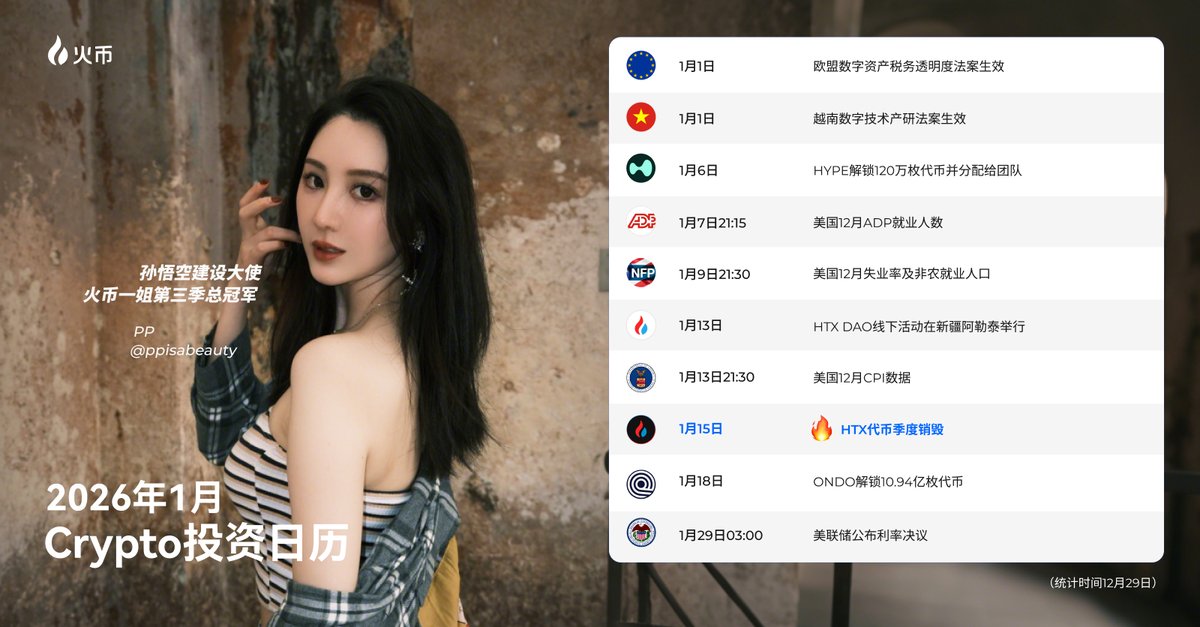 🤩 敲美的2026年1月加密大事件日历来啦! 这次的日历主角是: @ppisabeauty 来一起看看1月有什么新鲜事吧~ ❄️ 1月13日HTX DAO线下活动在新疆阿勒泰举行 🔥 1月15日 $HTX 代币季度销毁 🦅 1月29日3:00 美联储公布利率决议 💡 小技巧:将美美的图片设为电脑壁纸,重大事件就不会错过啦~