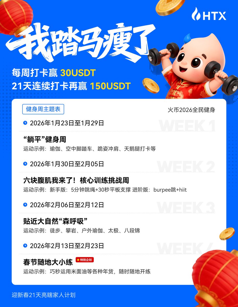 🤩运动也可以微微辣,微卷也能卷出好身材! #火币2026全民健身 本周主题——「躺平」也能赢! 关注转发并 #火币2026全民健身 Show出你的躺平健身大法吧! 🌶️ 抽奖微辣福利: 抽象戏精 1人 —— 15,888,888 $HTX (最躺的姿势,健最抽象的身) 硬核大佬 2人 ——各 73,333,333 $HTX (表面躺着,其实在偷偷练核心) 优雅潜力股 8人 ——各 4,666,666 $HTX (垫上运动达人速来!) 🎒 加码福利: 随手记录你的本周“微运动”打卡并 @一位好友 → 抽10人送运动双肩包