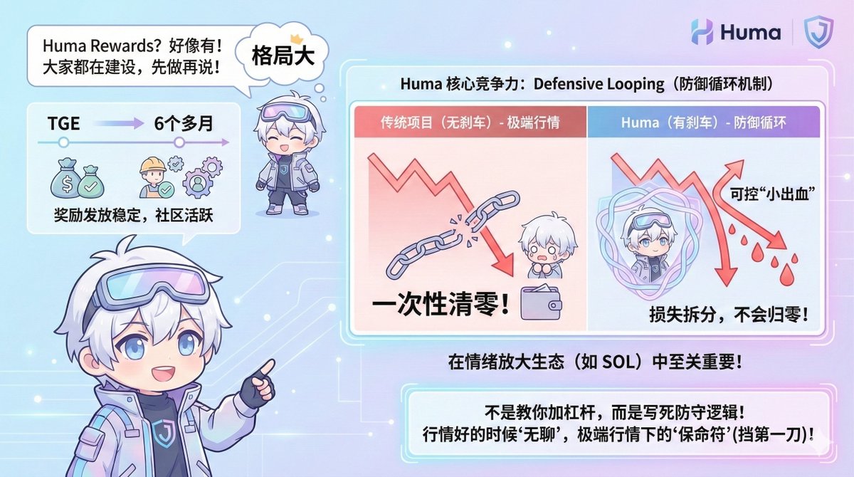 前两天有小伙伴问我,Huma @humafinance还有奖励吗,我现在好像也不太清楚,好像是说有,我看到还是很多人在输出建设的,我们先做在说吧,毕竟huma格局还是蛮大的 项目从TGE到现在半年多来,奖励发放一直很稳定,没拖过,社区活跃度也高,很多人在持续提供流动性、staking和参与建设 而且我发现很多关注的人都看着 Prime 模式的高收益、 $HUMA 的短期走势,却很少有人注意到它最核心的竞争力 ——Defensive Looping 防御循环机制 这个词听起来很技术,其实很好理解:行情暴跌、流动性瞬间抽走时,不让你一次性清零,而是把损失拆成可控的 “小出血” 在很多结算快、情绪容易放大的生态里,比如SOL,这一点太重要了,过去链上项目出事,往往不是因为 UI 不好用,而是没有 “刹车”,极端行情下只能眼睁睁看着资产归零 Huma 没有教大家加杠杆赚更多,反而在协议里写死了防守逻辑,行情好的时候,这个设计没人在意,甚至觉得 “无聊”;但一旦遇到极端行情,它就是能替你挡第一刀的保命符! #humafinance #DefensiveLooping