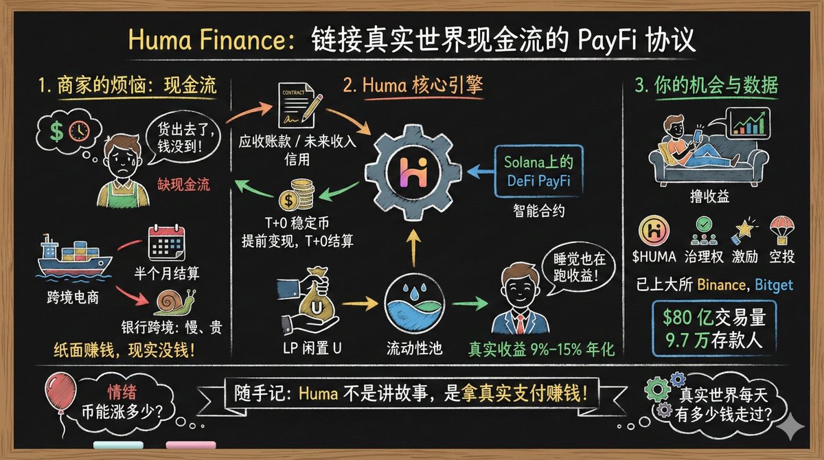 以前我一直觉得,链上想多赚点钱,不就是两件事:要么炒币,要么撸空投。 直到有天,一个做跨境电商的朋友跟我说,他现在靠一个叫 @humafinance 的东西,解决了“货卖出去了,钱还没到”的老大难。 1. 朋友的烦恼,都是现金流 他生意不差,订单挺多,就是一个字:穷。 货先发出去,平台半个月一个结算,银行跨境又慢又贵。 每天账户一看:纸面赚钱,现实没钱周转,只能到处借、到处垫。 后来他跟我说: 现在用 Huma 这种 PayFi 协议,把“未来的回款”,提前变成“今天能花的稳定币”,结算基本 T+0。 2. Huma 到底在干嘛 我帮你翻译一下 Huma Finance 在干啥: 它是建在 Solana 上的一个 DeFi 协议,专门做 PayFi,也就是“支付融资” 服务的是有真实收入、真实应收账款的生意,比如跨境电商、服务商 商家把应收账款、未来收入这些“信用”丢进来 协议这边有一套模块:评估、发放、结算、还款,全靠智能合约跑 钱从哪来?从我们这些存钱进去当 LP 的人来 结果就是: 像我朋友这种,可以提前拿到稳定币,不用再被结算周期卡死 像我们这种,有闲置 U 的,可以进去当“出钱的那一方”,拿 9%–15% 年化的真实收益 这些收益背后,对应的是现实世界的发票、订单,而不是空气故事 目前 @humafinance 已经处理了 80 亿美金交易,9.7 万存款人,流动性过亿,体量不算小了 3. 我这边怎么用,它大概长啥样 我这边的打法很简单: 稳定币有一部分,不放交易所,就拉到 Huma 的池子去撸收益 收益是按天算,属于那种“睡觉也在跑”的模式 想折腾一点的,可以去看看他们的 PST 这种高收益 LP 代币 再往上一层,就是研究 $HUMA 这个代币: 有治理权 有激励 还和各种空投、活动、像 Kaito 这种积分挂钩 已经上了 Binance、Bitget 之类的大所 如果你也想碰一下这类 PayFi,可以先记住三句大白话: Huma 不是讲故事的,是拿真实支付和应收账款来赚钱的 它一头连着做生意的人,一头连着我们这些想赚稳收益的人,中间靠稳定币和智能合约打通 入口就是 https://t.co/yEI2zxMKrf,有闲钱当 LP,或者直接关注 $HUMA +后面的 Season 活动,看自己风险偏好 大部分 DeFi 在讲“币能涨多少倍”, Huma 在讲“真实世界每天有多少笔钱,从它这条链路走过”。 前者看的是情绪,后者看的是现金流。 你更想站在哪一边,就自己选了。