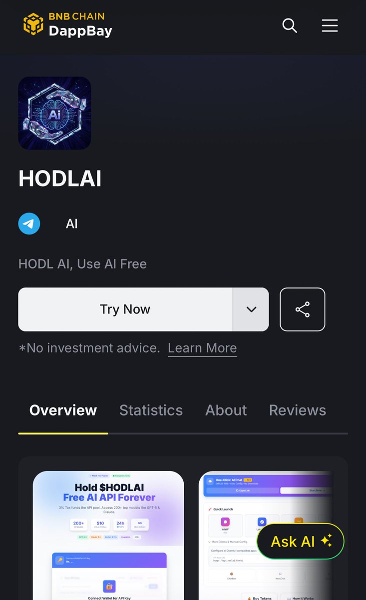 刚刚发现 BNB Chain官方页面,已经把 $HodlAI list 在Dappbay : https://t.co/Q318pFWBTg