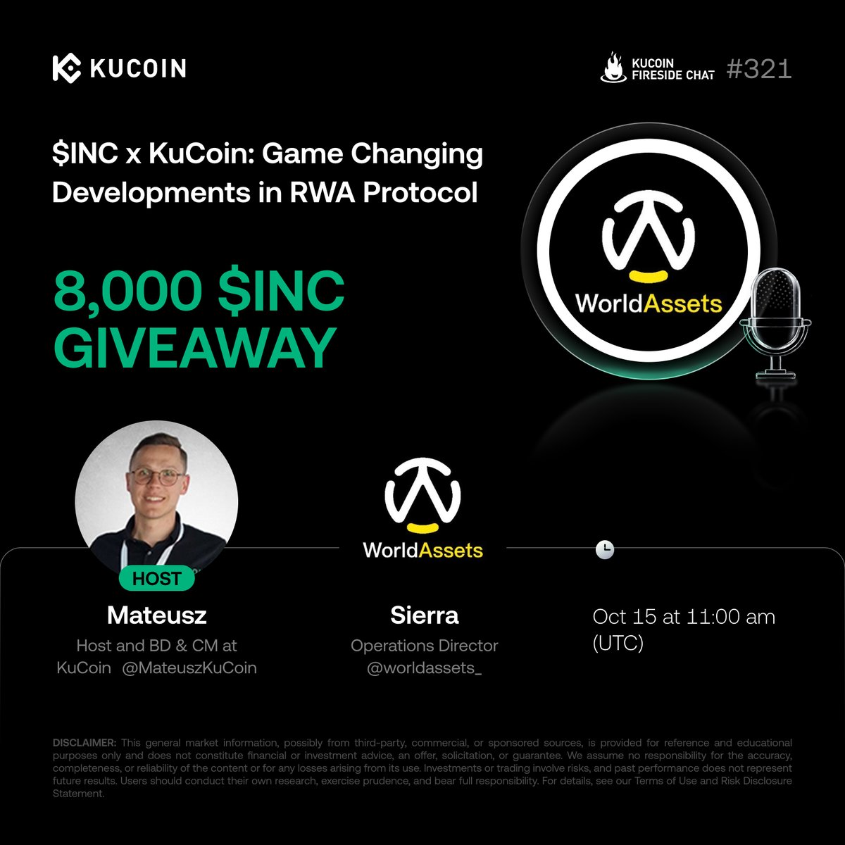 ⏰ Happening Today! 🎙️ Join our #KuCoinFireSideChat with @WorldAssets_ and discover how the RWA Protocol is transforming real world asset tokenization and unlocking new opportunities in Web3. 🎁 8,000 $INC up for grabs. Don’t miss it! 👉 https://t.co/PVn3O8NEAK #KuCoin #INC #Web3