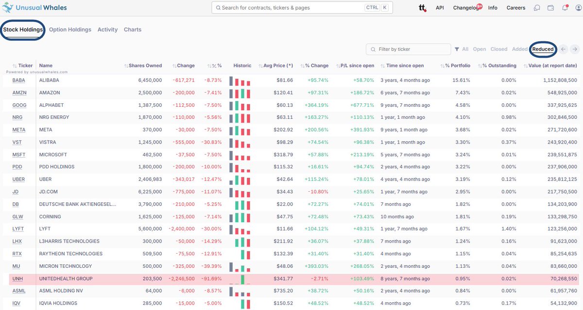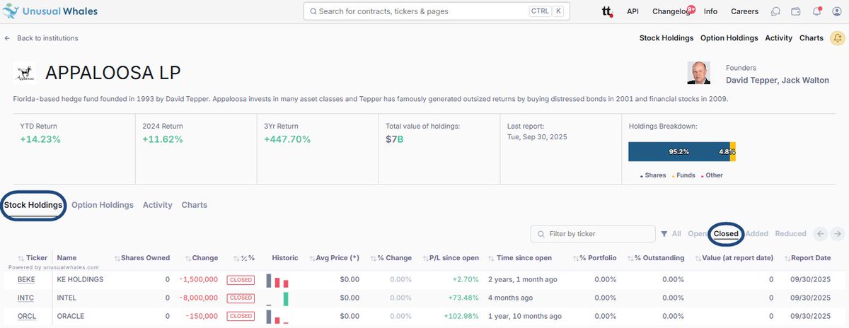 Look at this. Tepper's Appaloosa 13F investing themes. Theme 1: Profit-taking on impressive winners: $INTC (opened Q2 and closed completely in Q3) $UNH (added 2.45M shares in Q2, sold 2.25M shares in Q3) The Intel round trip was easiest to see by clicking on the "Closed" tab on the Unusual Whales institution screen: https://t.co/C4LX9hPLtu