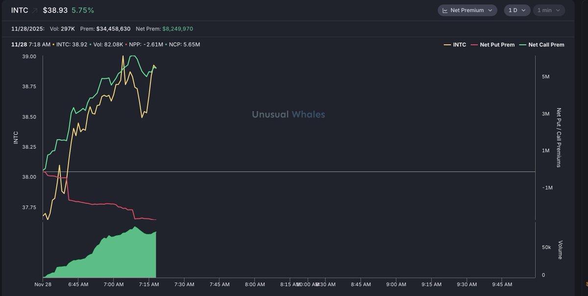 Intel, $INTC, is up more than 5%. See net premium on Unusual Whales.