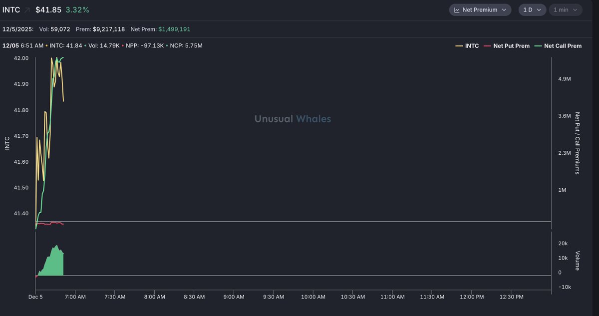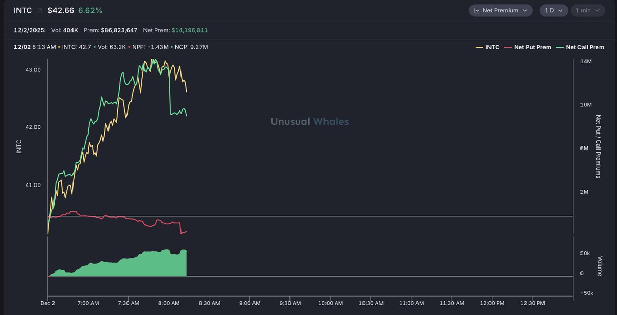 Intel, $INTC, is up more than 6% See the net premium on Unusual Whales.