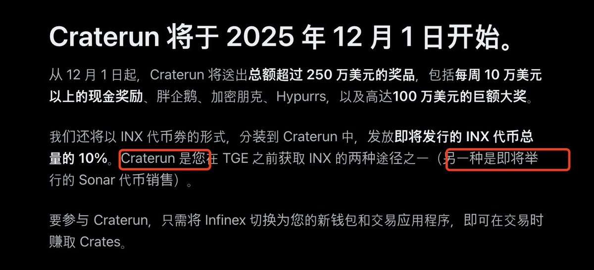 11月12日, @infinex 创始人 Kain Warwick 发布了题为"Infinex is Inevitable"的文章,全面详细介绍了 $INX 代币经济学和分配规则 $INX 代币 将100%空投给 Patron NFT 持有者,总供应量100亿枚。 主要获取手段,牛牛是一种卡牌游戏功能,类似于亚洲游戏文化中的21点或百家乐 奖励系统: 玩家通过每日挑战和卡牌游戏赚取"牛牛币"或积分 参与要求: 需要持续参与(如每日登录和游戏)才能获得资格 奖励机制 前100名用户: 获得 Infinex NFT(每个用户最多3个) 前1000名用户: 获得包含各种奖励的宝箱 积分转换: 积分可转换为宝箱或直接获得空投资格 反机器人措施: 平台采用反机器人机制过滤非有机刷取行为 $INX 代币空投规则 Patron NFT 持有者每个NFT获得10万 总计100亿 $INX µPatron 持有者按1:10比例 1个µPatron = 1万 $INX 团队/VC分配:0% 释放机制 锁定期: 12个月锁定 线性释放: 12个月线性释放 总锁定时间: 24个月(防止抛售并调整激励机制) 分配资格 快照时间: TGE(代币生成事件)时持有 Patron NFT XGP转换: ≥20万 XGP 转换为1个 Patron NFT(已于11月9日完成) 其他机制: 通过 Craterun 活动和 Sonar 公开销售扩大分配范围