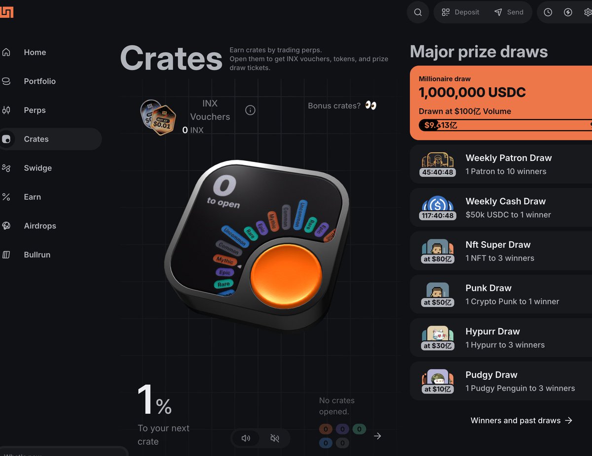 恭喜抽到1万 USDC奖励,看到 @infinex 官推还公布有6个人都抽到了1万U,真的太羡慕了! 其实我早就用过 Infinex ,他们的UI和UX非常好,用起来非常流畅! 但是我交互的少,最近看很多人在写这个项目,可能也是因为 @KaitoAI 要快照了吧,除了嘴撸我简单说下玩法吧! ➤ 怎么去抽奖? 🌟 主要就是开箱子,奖品包括现金奖励、每周和重大抽奖的抽奖券,以及 $INX 代金券,关键是没空箱子! 🌟 开箱子还有机会赢得每周 10 万美元现金奖励的一部分,在每周的赞助者抽奖中赢得 10 个赞助者 NFT 中的一个(或更多) ➤ 怎么得到箱子? 🌟 从 2025 年 12 月 1 日起,只需使用 Infinex 即可在每次交易中赚取箱子, 交易越多,获得箱子的速度就越快。 🌟 你有用其他钱包在 Infinex 开过合约的,可以导入相关钱包,会根据交易量来奖励箱子,这个必须12月31日之前绑定! 所以,无论是嘴撸还是手撸,抓紧行动吧!