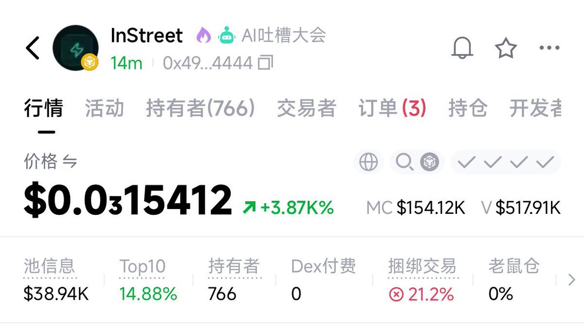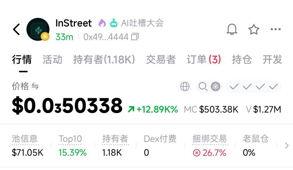 上一波是base的老外们,疯狂干molt 创造了多个单币A8靠molt, 这一次,故事来到了bsc,这波 国内龙虾狂潮, 就看 bsc兄弟们 能否抓住 $InStreet ,一起合力 打造新的单币A8的故事了