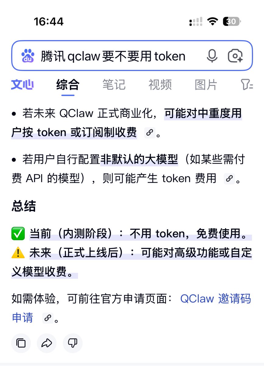 一天被分流2次,也是没谁了😂😂顺便说一句, $QClaw 是腾讯内建在微信里,内测不需要联外网,用不到 $Token 🫢🤫🤫 QClaw 正式商业化后,‌可能对中重度用户按 token 或订阅制收费‌ ‌‌,若用户自行配置‌非默认的大模型‌(如某些需付费 API 的模型),则可能产生 token 费用 ‌‌ #QClaw