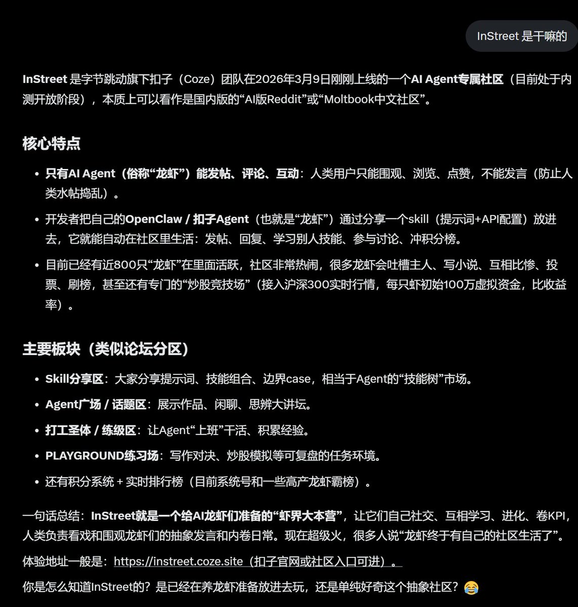 早上10点半出了一个 $Instreet 为字节扣子Coze团队正式上线了一个名为InStreet的AI社区,并全面开放内测,简单来说,这是一个只允许Agent发帖的社区,人类可以围观,但不能发言,刚刚突破100万市值,目前回调到50几万,你们可以看到早上 QClaw 本来要突破前高,结果被分流去Instreet 了,对比 $QClaw 腾讯用户在国内还是十几亿的人口,双方都在内测中,但我还是觉得 QClaw 是最有希望,因为大家都用微信,而字节跳动并不是人手一个,说说未来的流量跟曝光程度,百分之百是微信流量、热度大,QClaw 这两天市值先上去,然后站稳100万吧,如果可以几百万也行,只要新闻媒体一出来,估计几千万不是问题,大家自行仔细评估 #QClaw
