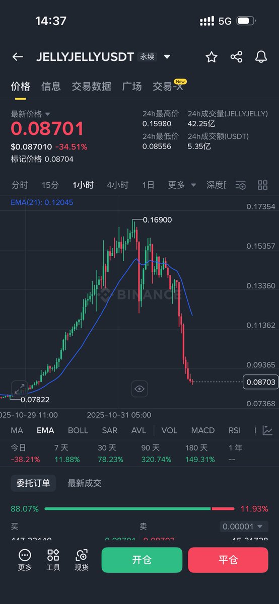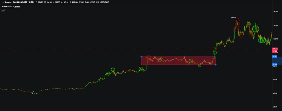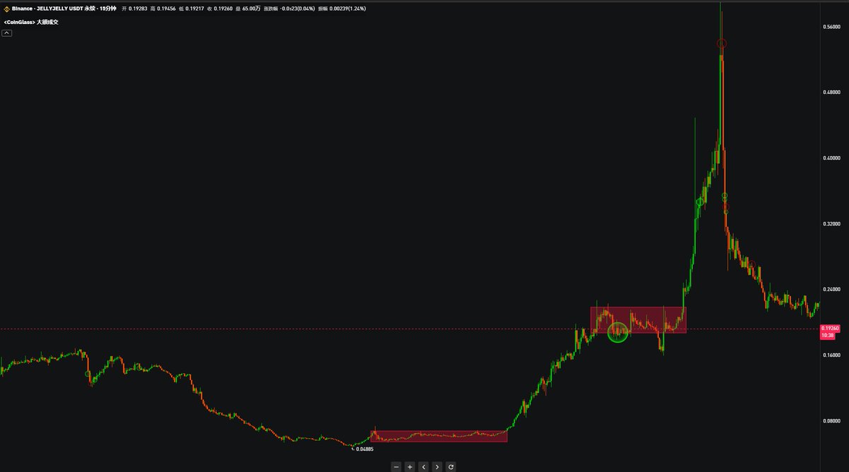 最近机会真多, $DASH $JELLYJELLY 两波行情完美的调整结构 DASH吃到了半段的涨幅 后半段踏空了, JELLYJELLY当时看到了没进, 从第一段开始就看见了, 主要前面跌的太猛了, 我感觉是个反弹就不想弄了, 谁知道是大V天龙, 而且第二段调整有点乱调整就开始拉了, 做交易做多了就有形态洁癖了, 稍微有点调整的不完美的就不想进了 除非控盘控的非常完美,才会考虑进场 从COAI之后,我就好像没看到一段完美调整结构! 耐心等吧,这种机会越来越稀有了。