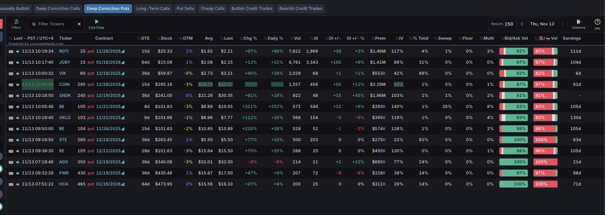 Here are the most "unusually bearish" options opened today in the market (changes quickly!): $RGTI $25 put 11/28 $JOBY $15 put 01/16/2026 $VIK $60 put 12/19 $COIN $295 put 11/28 $OKLO $103 put 11/21 Find the full list on Unusual Whales Options Screener.