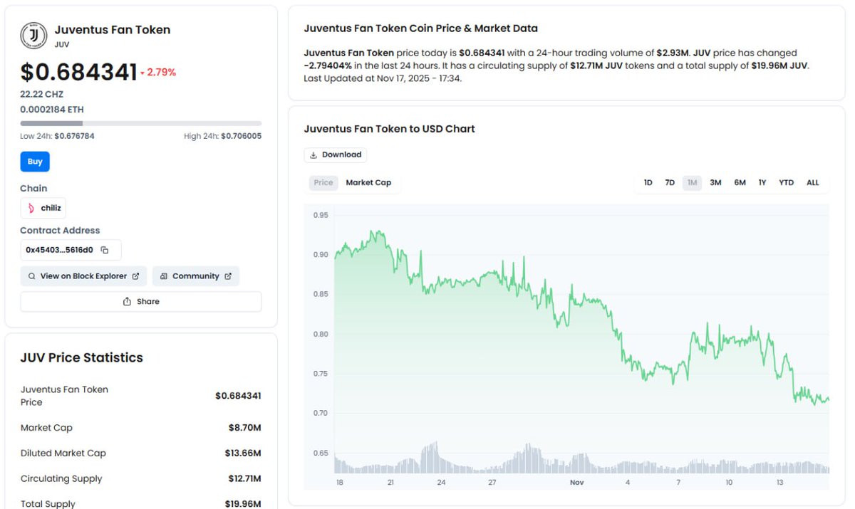 $JUV 运行在 Chiliz 生态,链上合约总量 19,956,000,Decimals = 0(整枚记账)主流数据源显示,流通量约 10.53M 枚,价格在 $1.55–$1.62 一带波动,截止写稿日,24小时上涨45.82%。
