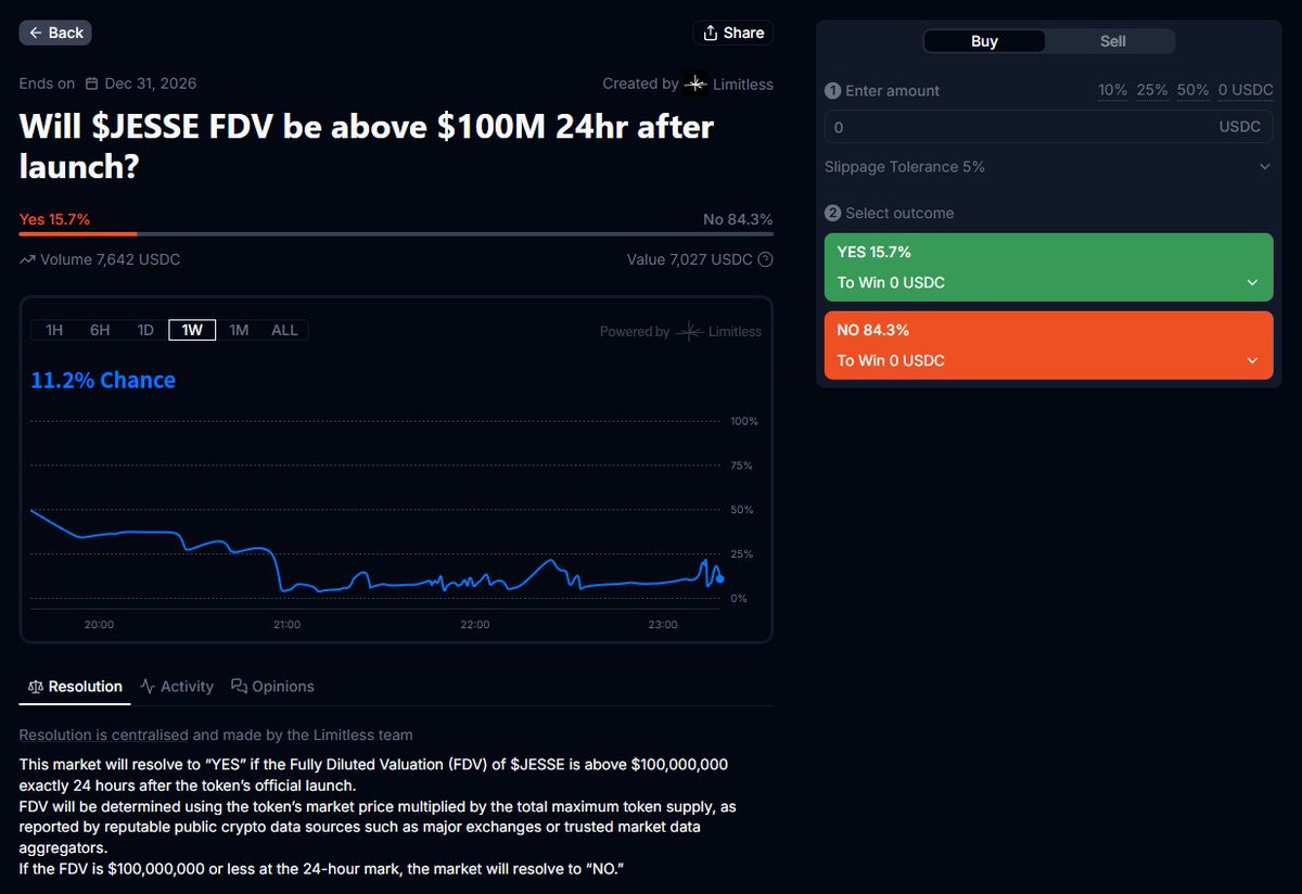 看样子是要被打脸了... 目前预测市场 @trylimitless 上面关于 $jesse 的首日市值破亿概率降到了11%... 好家伙,你们一边到处求邀请码,说要塞进去,一边这么没信心啊... 果然熊市给人带来的心理影响还是很深刻的,现在BTC如果在破新高,怕是这个概率早就99%了...
