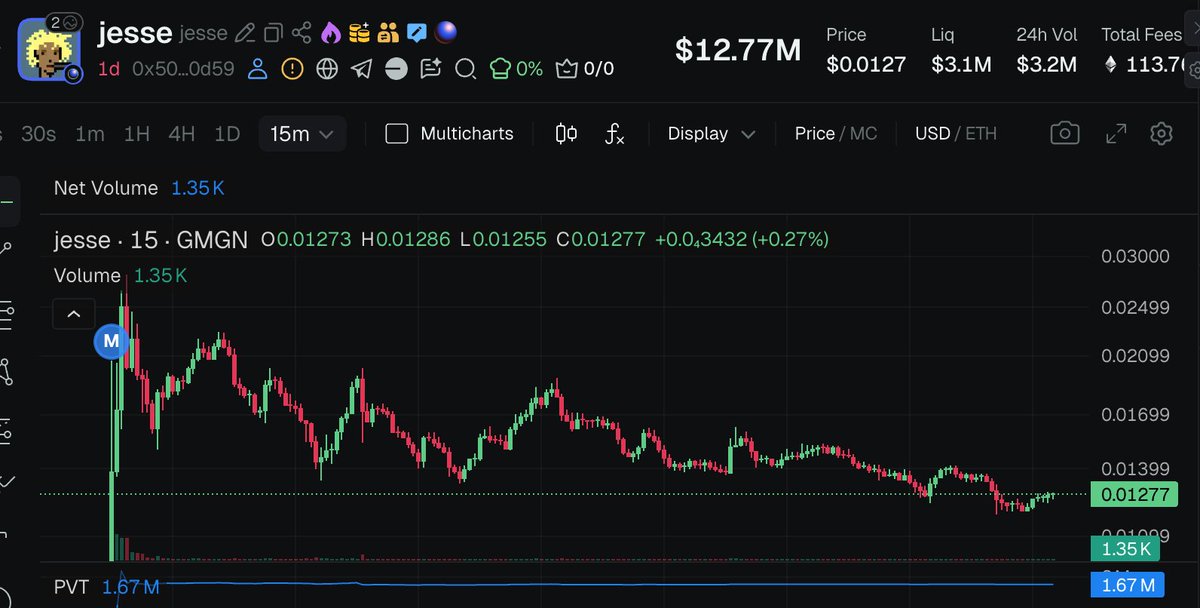 Base 链总教头 @jessepollak 死命喊单的同名meme 币 $jesse 不出意外地走出了老奶奶下楼梯的走势,韭菜自我觉醒,已经开始不愿意买账了。 Jesse 透支自己的信誉,为 @base 链创造了单日60万美元的手续费收入。无论是此前喊单NFT,喊单meme 币,还是现在以自己名义公开发币,都是Jesse 全力助力 @base 链攫取手续费的一环。 Base 印钞机哔哔哔暴力运转,Jesse 过上了Base 人生。 而你,我的朋友,也过上了 $jesse 人生。