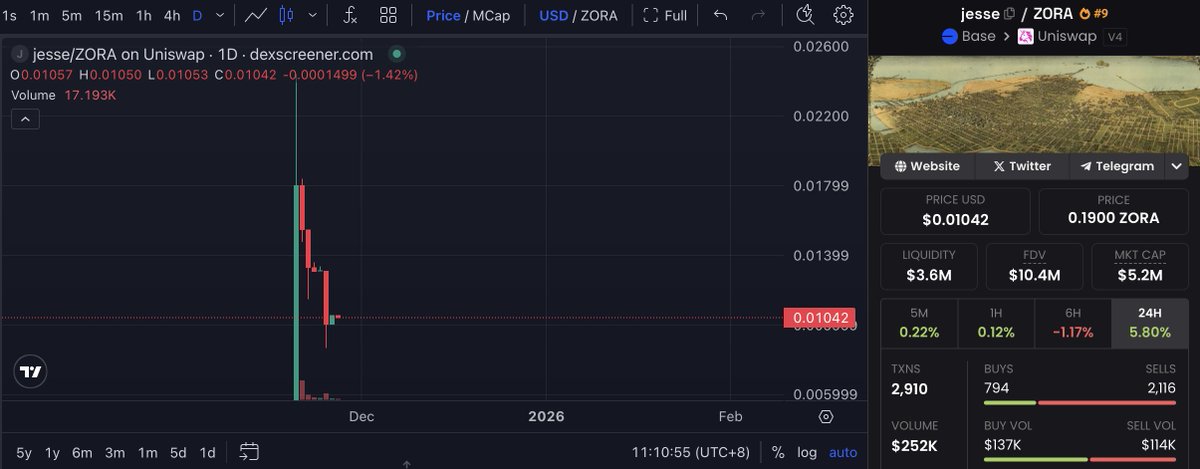 “无庄不成市” Base干这种“孩子光生不养”的事儿太多次了, $jesse 早期的筹码他们自己根本就没去控,我开盘狙进去几十个钱包之后,再一看筹码结构就心里有数了 纯散户就是归零,而且部分散户出于对 $jesse 和Base的“信仰”买了很多,未来Base团队想自己把筹码再控回来估计也不太容易 $0.025 我在Space让大家跑,除了上述原因,还有几个判断依据: A/ 「天时」很重要 大环境太差了,所有真正聪明且有实力的庄家都不会选择在此时「逆流而上」,后手筹码肯定是等🐟出现再打。 B/ jesse想的还是Base这条公链本身 中西方散户的思维还是差异很大,人家说了,社会实验,西方散户也理解并接受风险;要是个中国人搞这么一个币,跌了必须得找个人垫背or维权🥹 C/ 认知错配 jesse的Zora主页不知道你们看了没,发了好多个币,都是没人管的,这也很正常 负责公链运营的, 并不懂Dapp和协议的运营, 大概率也更不会懂二级市场的代币怎么坐庄操盘。 比如Monad生态,对所有项目方都抠抠搜搜,唯独大方地给了一个3M的项目方,在主网上线前还Rug了 和Monad的人聊了一下meme这块,发现几乎是完全不懂,但是却想复制Solana的meme神话,他们甚至都不知道pump当年做起来靠的是哪家机构