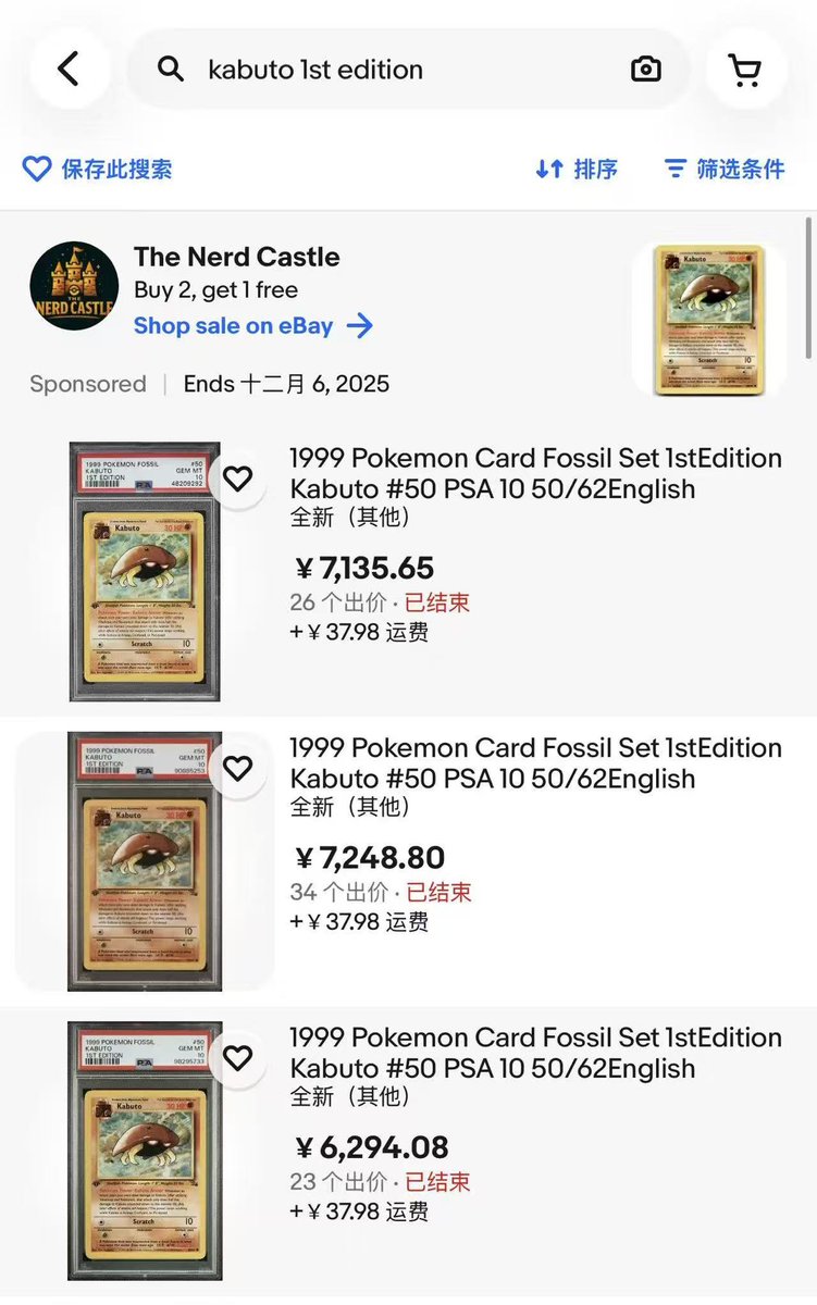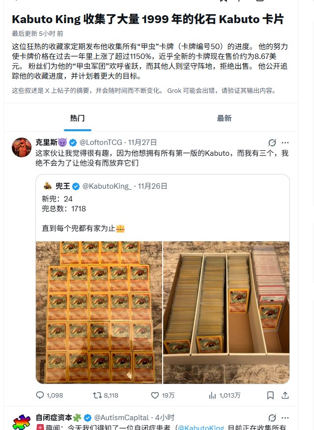 寶可夢:病毒式壟斷點燃狂漲100倍 收藏家@KabutoKing_正瘋狂收購所有1999年初版化石盔(Kabuto),已囤1748張,誓言統治市場! 原本0.1美元的常見卡,如今飆至10美元以上;PSA 10等級更從11月初不到100美元,狂漲至600美元大關,今年漲幅逾10000%,堪比神奇寶貝界的 GameStop (只差不能做空) 從8月起,他的X更新如戰報,從最開始的69張到現在;市場供應枯竭,eBay難覓近新品。 https://t.co/2k8vsH87Ta 最近24小時銷售暴增,歐美幣圈沸騰,有人競標到600美元還被出價更高!這卡牌市場超有趣,像極了當年的NFT交易,但最壞情況就是握著「實體的心愛之物」。 連 @dcfgod 都笑稱「DCF資本在找Kabuto😂」。 下一步?化石盔代幣再來DATs股票、建國家儲備、推Kabuto ETF?Solana上甚至冒出 $KABUTO 迷因幣,收益全捐王者掃貨。YouTube/投資人 GrahamStephan 調侃:「這才是gotta catch ’em all!」 持有者們,HODL吧!這可能是家族世襲資產,更多人想握歷史一角。 Kabuto is King 👑🪨