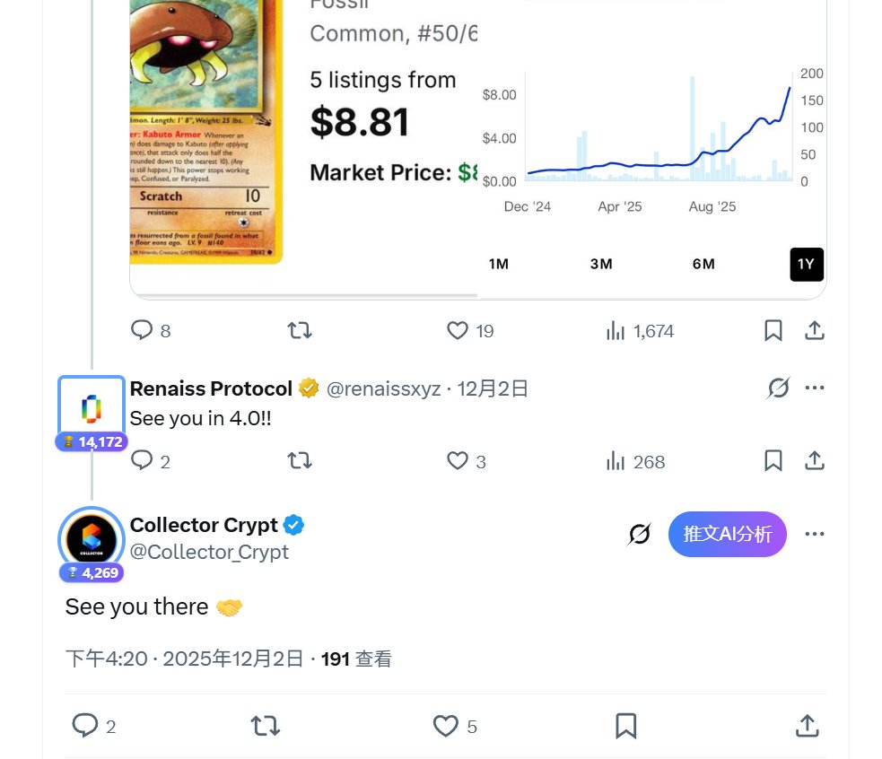 中文区在吃捐款、男女关系的瓜,而英文区最近TCG赛道突然因为一件事爆火了。 起因是一个自称为 “Kabuto King” 的神秘收藏家,他宣布了一项疯狂的计划——收购并囤积世界上所有的“初版 Kabuto(化石盔)”宝可梦卡牌。 Kabuto 这种 Pokémon 本身就挺低调的,以前一张卡才值不到 1 美元,但自从他 2025 年 8 月开始行动后,价格已经飙升到 43 美元以上,甚至有些卖家开始囤货抬价。根据他推特更新,目前已经拥有超过1700张Kabuto。 同时在Solana上还跑出来一个名为 $KABUTO 的meme,用部分交易税资助Kabuto King继续收购Kabuto卡片。 尽管很多人都是抱着娱乐的心态参与,仍然在短时间内引发了社区共识,币价涨幅一度超过6倍。TCG赛道的其他meme也受到影响集体拉升了一波。 Kabuto King 的‘暴力囤货’并非什么金融创新,本质上不过是传统的坐庄游戏复刻。但它之所以能引发轰动,某种程度上暴露了当下加密市场的一大痛点:能够像之前火爆过的NFT和GameFi一样,低门槛链接 Web2 世界、且能瞬间引爆注意力经济的载体已经很久没出现过了。 我看好 TCG 赛道的原因在于它既有 Web2 的收藏积淀,又有 Web3 喜欢的波动性。Kabuto King 证明了这张牌可以打响,而Renaiss这样的 TCG RWA 的使命,就是将这种原始的冲动规范化、金融化。 @renaissxyz 是 BNB Chain 上第一个 TCG RWA 的项目,从之前的Aster 到最近的Opinion 我们可以观察到,BNB 生态很擅长在一个热门赛道复刻龙一的成功。而对于TCG 赛道来说,真正的龙一可能还没出现。 今天晚上8点会上线Pack 4.0 ,这也是Renaiss 内测期间的最后一次卡包发售。上波3.0发售一个多小时就被抢空了,这次估计会更快。 上次忘了去抢的我狠狠拍大腿,想参与的记得定闹钟。