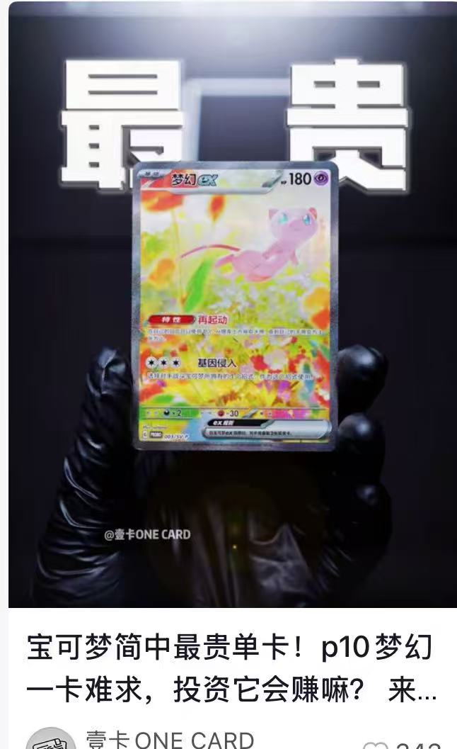 $梦幻 这个不错,宝可梦分为三种版本 简中,日文,英文版本 简中区最具代表性的是 梦幻,PSA10的大概10w一张 日文区最具代表性的是 换装皮卡丘 英文区最具代表性的目前就是 $KABUTO 还有喷火龙 BSC上边国人炒作 梦幻应该是正确的 买了一点 0x7fa42e5f6538e35b40b1dd3e27744f12f2b64444