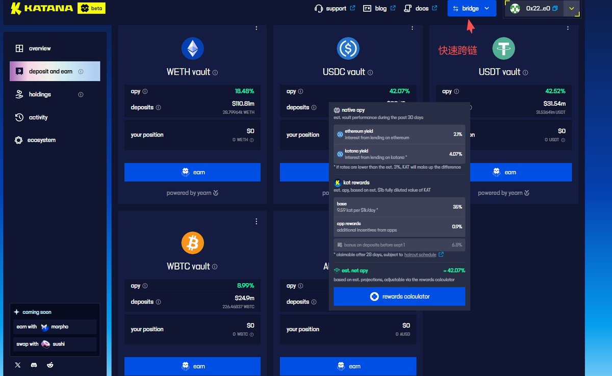 赚取收益:通过 Katana 的 VaultBridge 跨链桥,将 ETH、USDC、USDT、WBTC 等资产转移到 Katana 链,获取收益。