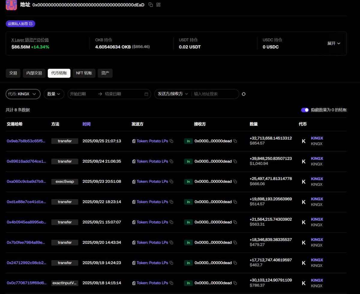 0.25% 每日销毁:$KINGX 每天烧,OKB 不动,极致通缩,币越少越值钱!