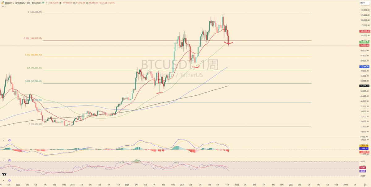 一,碎碎念 这几天一直在医院,住院的时候大饼还有106K,出院的时候大饼只有95K了,可谓是同时遭受了物理和魔法攻击; 但是正如看医生是为了让病好起来,下跌也是为了更好的上涨。 二,对于 $BTC 的一些观点 1,从大饼ETF通过之后,我就一直保持着一个观点:就是过去以大饼减半周期作为主要推动力的牛熊周期转换将不复存在,此时此刻也只是恰逢大饼高位与四年周期的时间节点重合而已,跌了,什么都可以是理由; 2,自美国主导加密以来,大饼成为了越来越多的机构与国家需要主动配置的资产,大饼的参与人群以及整个加密货币圈子目前的定位决定了大饼今后很难会出现过去熊市周期动辄70%-80%的暴跌; 3,我给的定义是:10%-20%是短期调整,30%是中期调整,30%-50%是长期调整。 三,技术面怎么看 1,周级别MA60均线现在的价格是98500,这条线也是本轮周级别上涨趋势的重要支撑均线,也是我个人定义的“牛熊分界区间”的下沿; 2,目前已经跌破,经过综合考虑我认为,此次调整的调整级别要大于2024年3月以及2025年2月的调整级别,是针对15476以来的整体上涨的调整; 3,上涨不是一条直线,同理,下跌也不会是一条直线,当大级别的下跌趋势形成,而次级别显示指标超卖,并到达支撑位,往往反而是反弹的位置。 四,其他的机会 1,加密货币不是只有大饼,大币种中,除了共识老二ETH,瑞波的XRP,MEME之神SOL,币安的BNB,也都在施展的浑身的解数来吸引资金的青睐,虽然个有个的特点,但是加密货币玩的就是共识,ETH虽然一直在被瓜分份额,但是目前为止,确实还是共识第二; 2,这个共识老二,在短期内,以上的大币种抢不走,其他的妖币们更不要提,比如之前的 $KAS ,现在的 $ZEC ; 五,难玩的市场 1,从2023年初开启的上升趋势到现在位置已经接近3年了,好像终于要迎来了一次真正意义上大级别回调;理论上来讲,涨了3年,休息一下,没什么问题; 2,但这届玩家也确实是加密货币10几年来最难的一届玩家,山寨的崩塌、热点赛道的频繁切换、频发的人工作恶、极致的操控造成了大饼长牛,玩家们钱包长熊的奇特现象; 3,我个人大部分情况也是每每靠着趋势赚的钱,都要在赌山寨的路上还回去一部分;截止目前,相对来说较为大型的山寨行情,只有2023年10月和2024年10月两波,剩下的全都是阶段性行情;两者相比的区别在于:1山寨行情持续的时间,2山寨拉升的高度,3山寨币拉升的广度。 4,那种大型的山寨行情一定还会有的,在90%的人都熬不住的时候,可能,不是现在。 我在23年就提出过这样一个观点: 加密市场已经从一个奖励钻石手的市场转变成为一个奖励交易员的市场,这是市场变得成熟的体现,也是难度增加的体现;虽然知道,但是适应起来依然很不容易,只能说加油吧,扫了一圈,这个市场依然是整个交易市场中,小资金最容易获得第一桶金的市场,最容易实现财富自由的市场。 区别是,过去,你可能走走道,大风就把钱刮进了你的兜里,现在,你可能需要弯腰仔细的找一找。