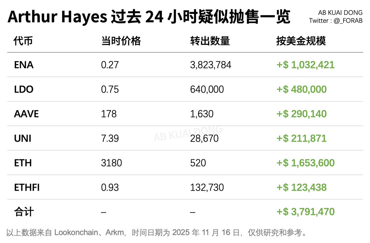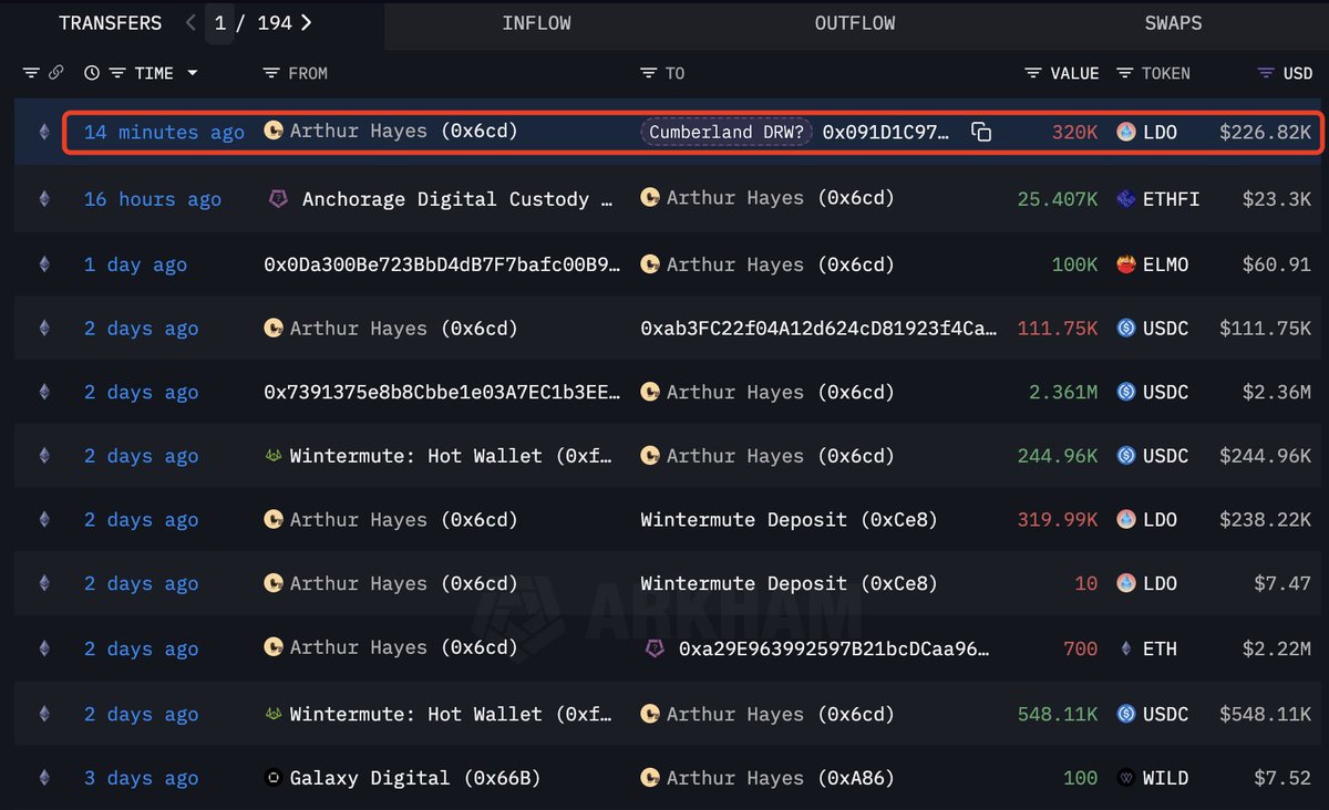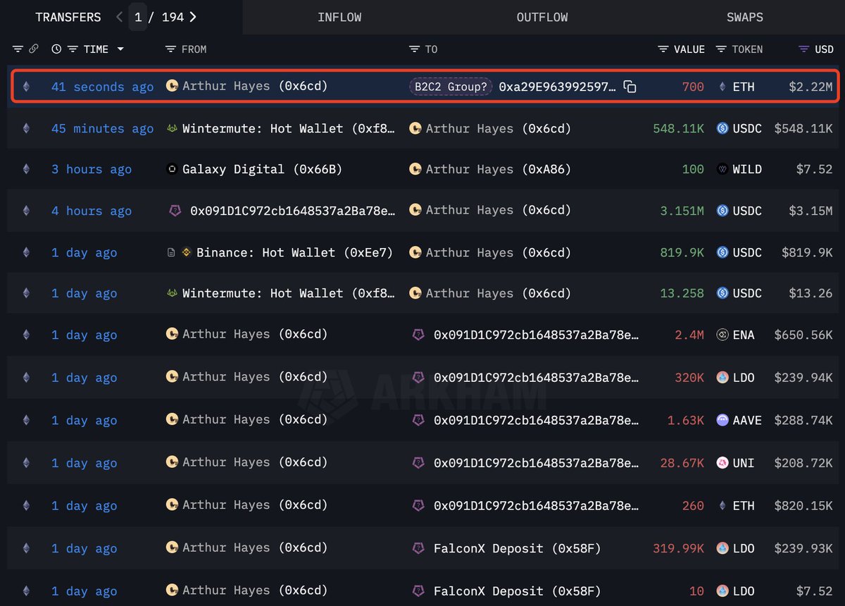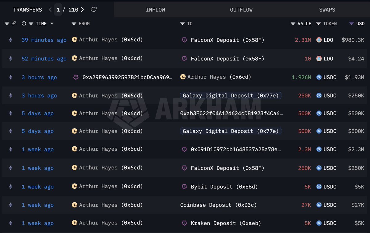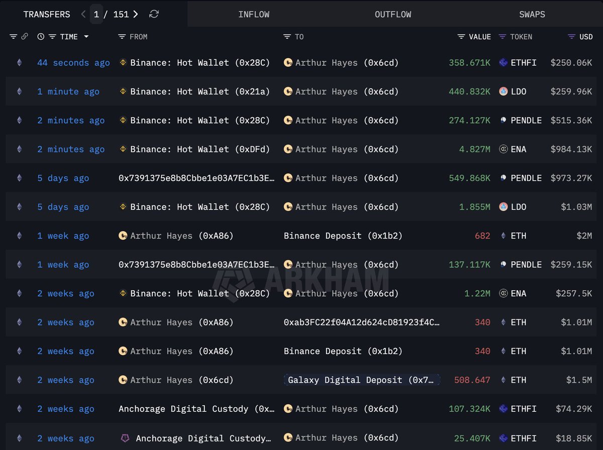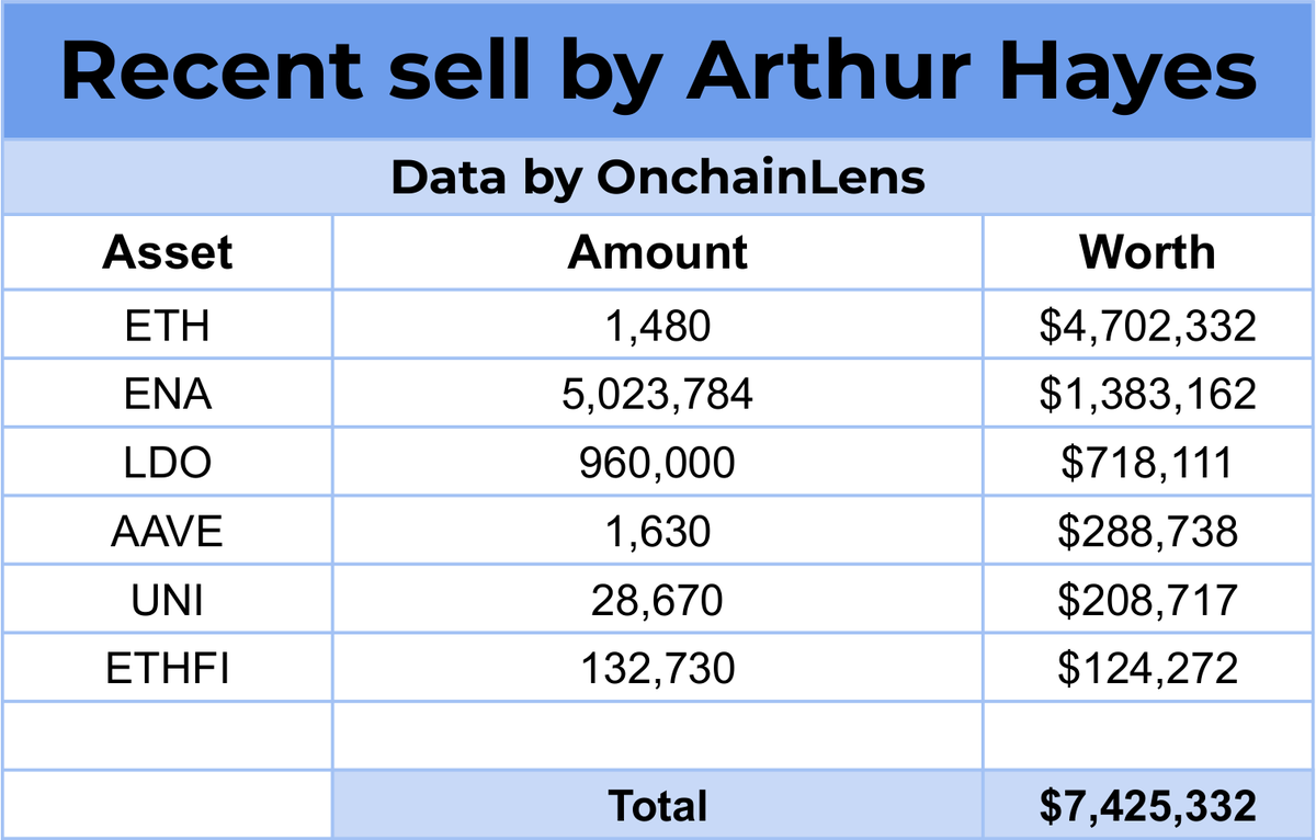 Arthur Hayes(@CryptoHayes) continues to dump his holdings!