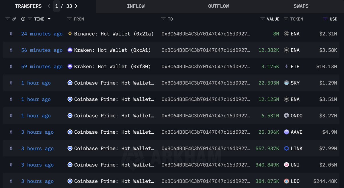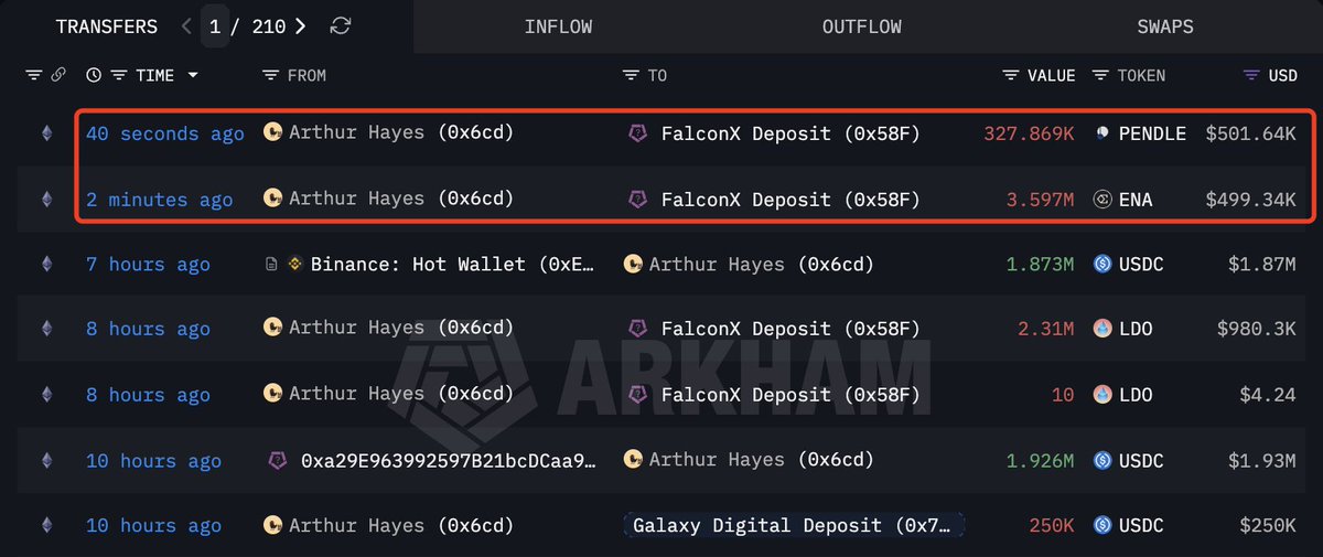 Arthur Hayes ( @CryptoHayes ) 向#FalconX发送了 3,597,122 $ENA ($499.34K) 和 327,869 $PENDLE ($501.64K),并且可能还会发送更多资金。