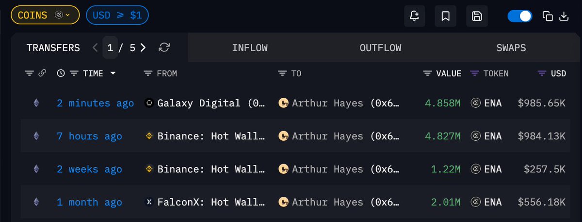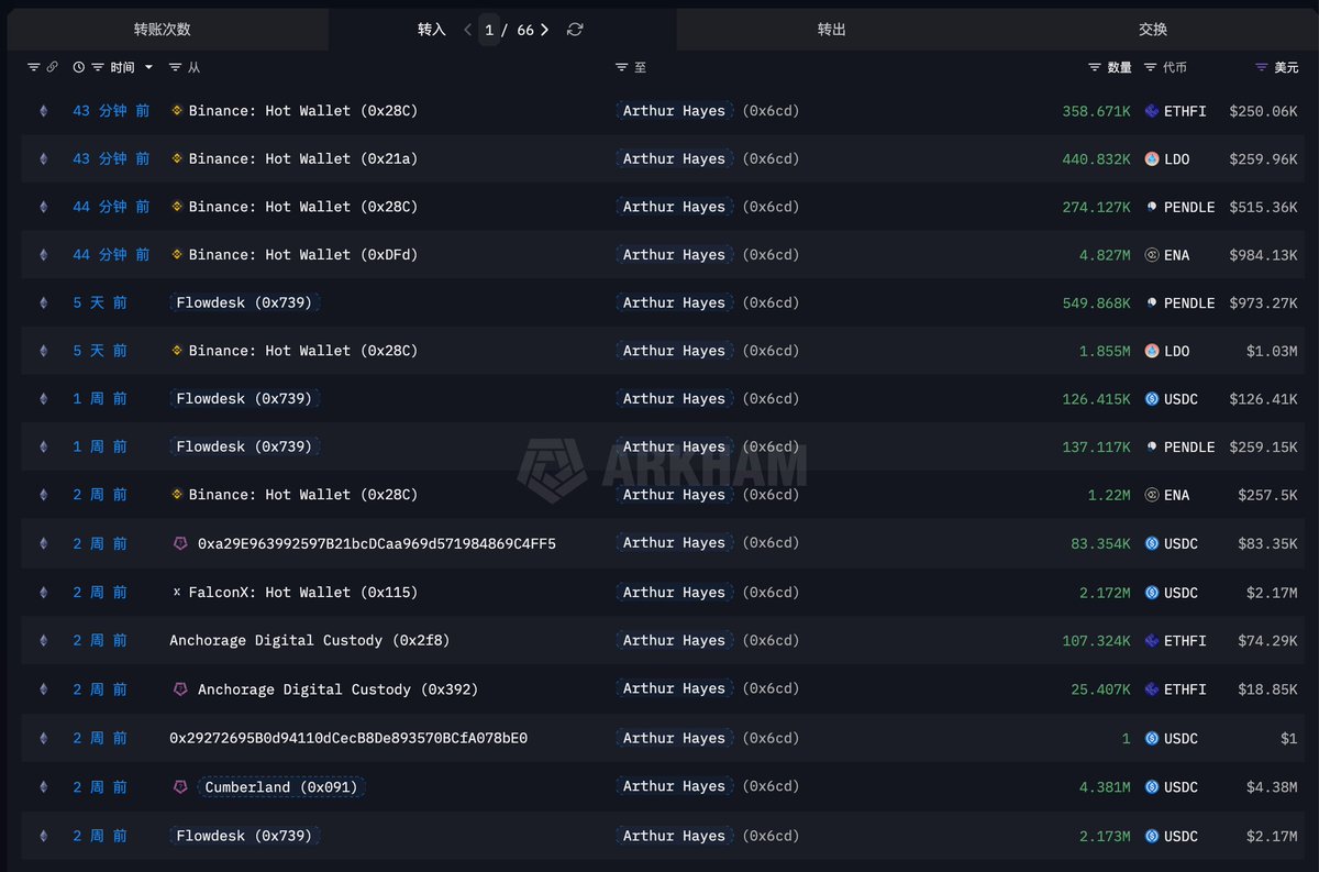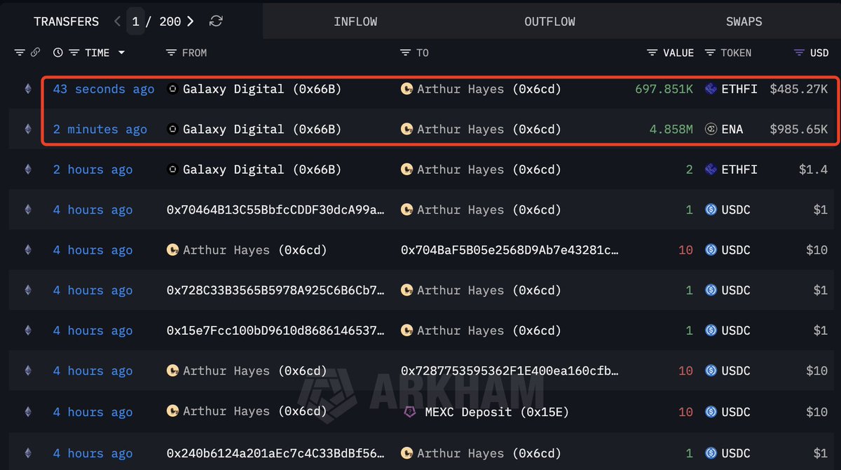 两分钟前 Arthur Hayes 再次从 Galaxy Digital 处收到 485 万枚 ENA,价值 98.5 万美元