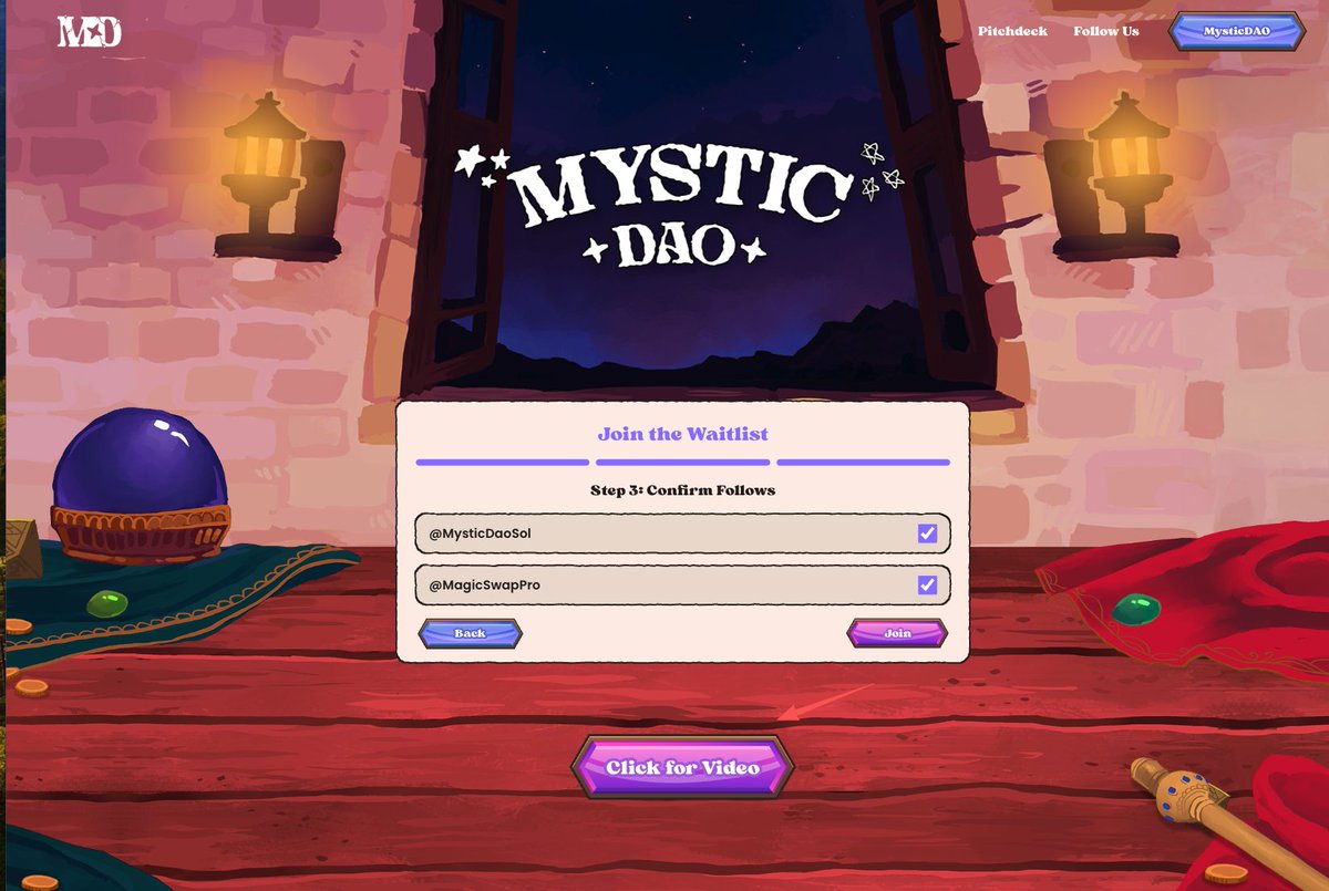 行情不好,不如做点任务,顺手拿一个 $MYSTIC 的候补资格。进入官网输入钱包地址和推特账号即可完成: