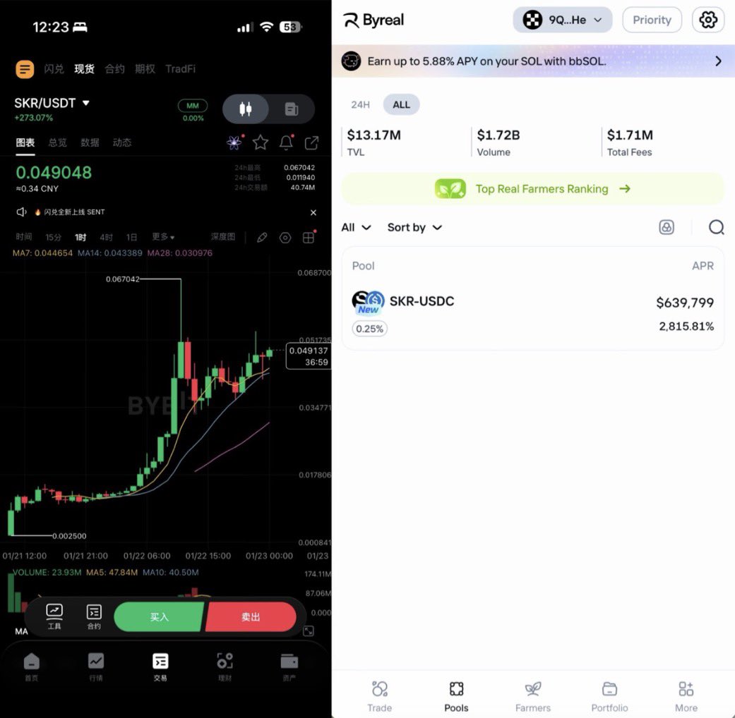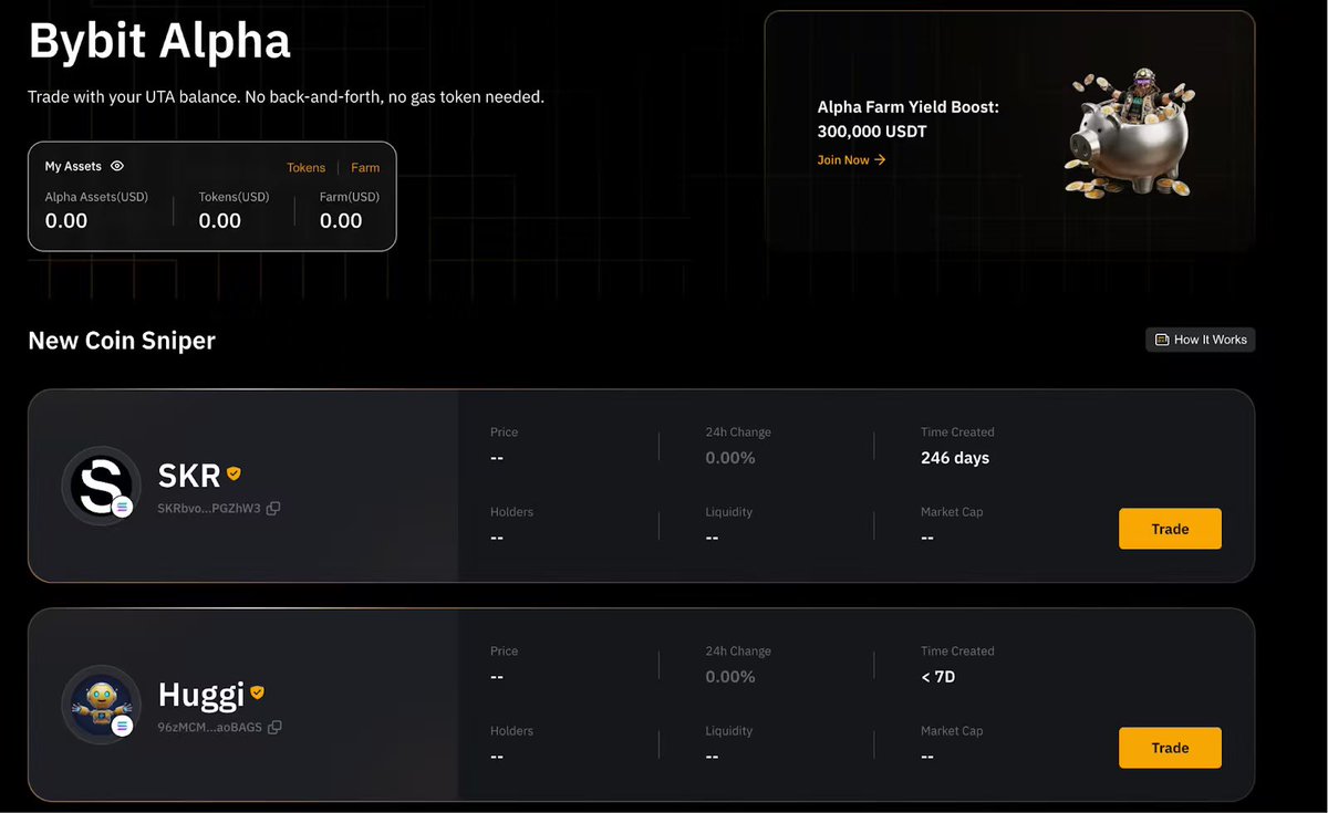 上次 $whitewhale 时候,我就说过要多关注Bybit Alpha,这次新上的 $SKR 两天时间5倍,再一次证明了bybit alpha团队的选币能力。 Bybit Alpha和自家dex @byreal_io 深度整合,提供了alpha代币的质押挖矿,有非常高的收益率。 Bybit alpha目前的选币质量和上币速度,应该已经远远超高了moonshot,成为了Solana meme的优质窗口,像近期大热的AI代币 $Mia 以及 $GAS 首先被Bybit Alpha 捕获并快速上线,其后才被Moonshot 认证和上线。 Bybit这也算是押注meme的春天还是在sol诞生了。