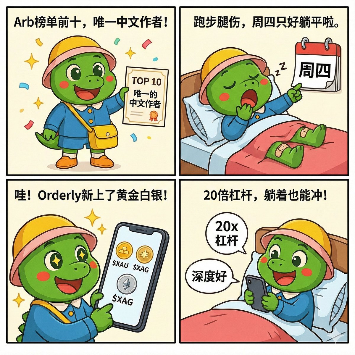 昨晚发了Arbitrum 上个月的创作者奖励,钱没有多少,但小恐龙是上个月 $arb 创作者排行榜前十名中的唯一中文作者耶🦖 昨晚跑步肌肉有点拉伤了,今天休息睡了一天,干脆以后每周疯狂星期四都休息好了,嘿嘿 @OrderlyNetwork 最近添加了多个新永续合约对,包括 $LIT 、 $XAG (白银)、 $XAU (黄金)、 $MON 和 $TNSR , XAG 和 XAU 是热门对,交易量位居前五,提供高达 20x 杠杆,深度还挺好的 希望可以添加更多更丰富的交易对噢 @OrderlyNetwork 🐸 #orderly $ORDER