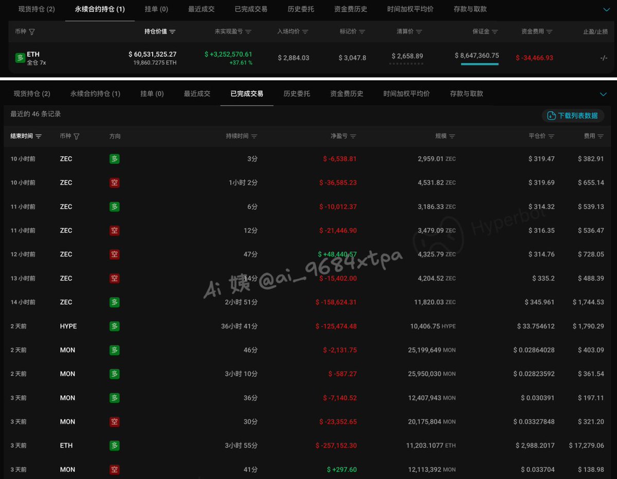 哪有赌狗天天输,高频合约交易者 0xa43...57d28 终于靠 $ETH 暂时翻身了,说他是麻吉二号也不为过😂 Hyperliquid ETH 多头持仓 TOP2 地址现已浮盈 332 万美元,三天前开启 ETH 7x 多单,持仓 19,860.72 ETH(约 6058 万美元),平均开仓价 $2,884.03 在此之前,他近三天的 19 次交易中只有 2 次小额获利,胜率地址 10.5%,且和麻吉一样对着 $MON / $ZEC / $ETH 三个代币死磕,多空来回倒腾 传送门 👉 https://t.co/8BURCmeX0f