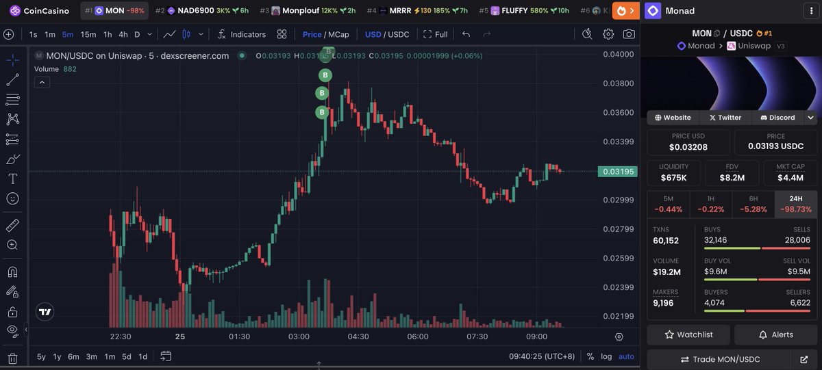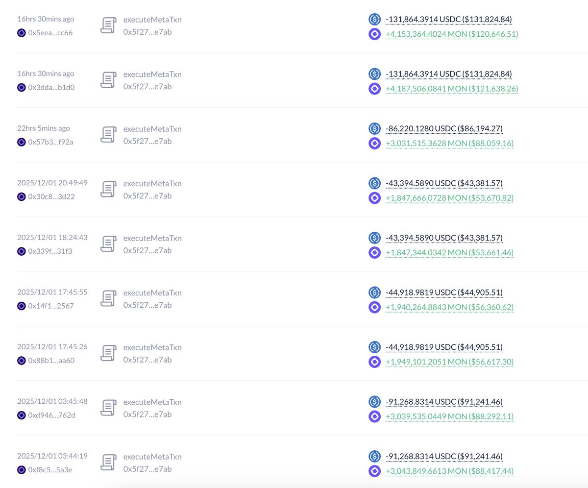 Whale 0x755b keeps buying $MON. Since launch, he has spent 2.31M $USDC to buy 70.64M $MON at an average price of $0.03267 — now sitting on over $250K in unrealized losses.