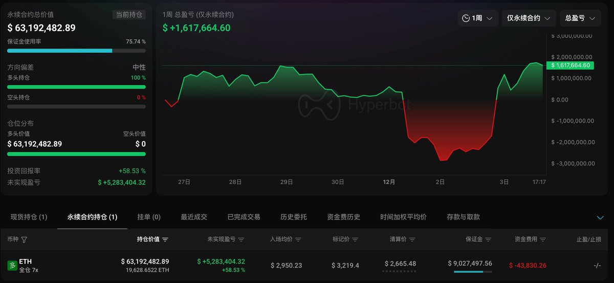ETH 突破 $3200,麻吉二号已浮盈 528 万美元! 高频合约交易者 0xa43...57d28 目前仍持有 19,628.65 ETH(6322 万美元),平均开仓价 $2,950.23,也是 Hyperliquid ETH 多头持仓 TOP2 地址 这次 $ETH 多单的浮盈已完全覆盖他近三天 17 笔交易的亏损 传送门 👉 https://t.co/JJ442DTE8X