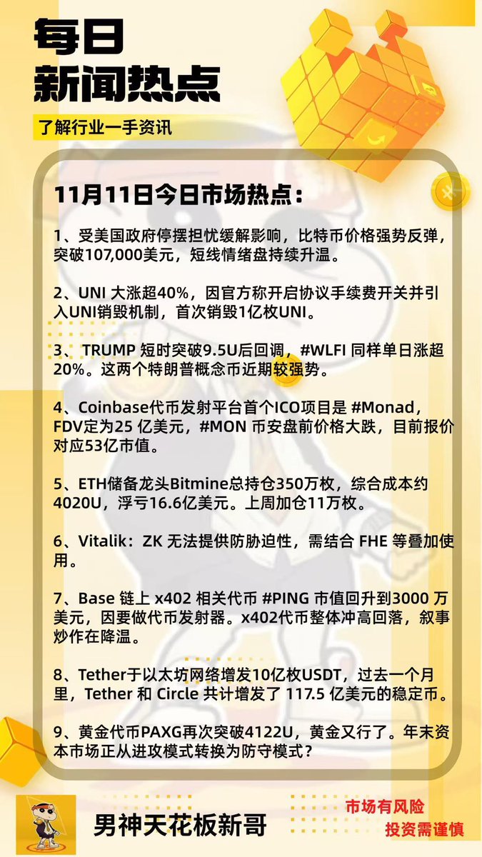 $UNI 大涨超40%Uniswap 官方开了协议手续费开关,还引入了 UNI 回购销毁机制,第一次就直接烧掉 1 亿枚。照现在的收入算,一年大概能回购销毁 4.6 亿美元,年化通缩率 5%。 以前没人接盘,现在项目自己掏钱买币了。 Coinbase推出面向散户的代币销售平台,首发项目选了 $MONAD ,拿出 7.5% 代币、按 25 亿 FDV 卖给散户,还允许单号申购上限 10 万美刀,力度不小。但币安 $MON 盘前大跌,说明大家对这个估值其实挺谨慎的,项目有热度,但别盲冲。 Ok链Xlayer 第一个 X402项目 $Hello402 跑路,现在官方正在和项目方对线中,去中化链上项目官方参与,这不是个好事。