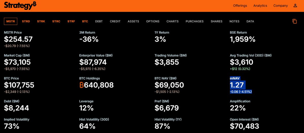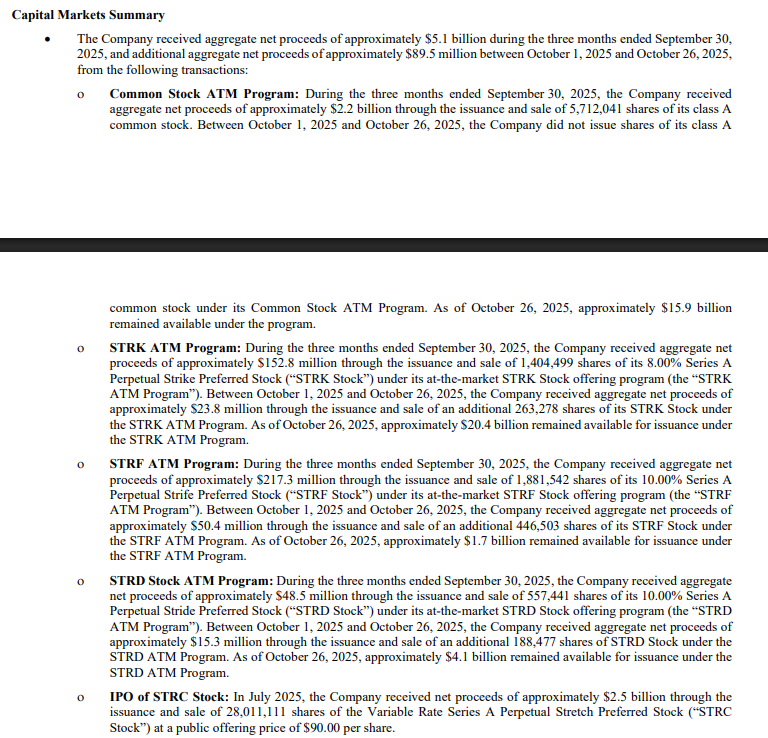 聊聊 $MSTR 的财报 - 2025年第三季度 写在前边,周四美股闭盘后公布了 MSTR 的财报,每股收益 8.42 美元,市场预期 7.90 美元,第三季度收入 1.287 亿美元,市场预期:1.183亿美元,MSTR 第三季度的财报超过市场预期,盘后价格上涨了超过 5% 。 截至到2025年10月26日 MSTR 一共持有 640,808 枚 $BTC ,总成本为 474.4 亿美元,折合每 Bitcoin 成本为 74,032 美元,目前 BTC 价格 107,300 美元,账面盈利213.33 亿美元。其中第三季度的净盈利(账面)是 28 亿美元。 这是一个什么概念呢? 标普500中的 American Express ,也是全球资产排名第67 名,在2025年的第三季度利润是 29 亿美元。另一家知名科技公司 Oracle (甲骨文)第三季度的 GAAP净利润为29亿美元。 这并不是说 MSTR 有多厉害,MSTR 在最新的标普最新的评级中获得了 B- 的垃圾股评级,主要原因就是 Bitcoin 的价格波动太大,所以我反而觉得标普给 MSTR 的评级基本上就是给 BTC 的评级,无非就是单纯的 BTC 可以稍微高一级到两级,因为没有杠杆。 所以 MSTR 的净利润(账面)基本已经符合了全球前100公司的标准,当然主要就是 BTC 价格赋予的。 危机? 截至2025年9月30日,MSTR 持有现金及现金等价物 5,430 万美元,是不是只能买 5,430 万美元的 Bitcoin 了? 并不是的,MSTR 不是靠现金买 BTC,是靠资本结构买 BTC,通过发行股票、债、结构化信用,把法币换成 BTC。 而实际上在2025年第三季度的财报表明,截止到 2025年10月26日 MSTR 通过多个 ATM 程序的剩余发行额度合计约 421 亿美元,说人话就是 MSTR 最大可以买价值 421 亿美元的 Bitcoin 。 那么为什么 MSTR 在第三季度放缓了 BTC 的购买? MSTR 将 Common Stock ATM Program(普通股发行程序,剩余额度约 159 亿美元)分为三个区间,根据 mNAV 水平决定发行强度和用途: A. mNAV 阈值 < 2.5x 战术性(Tactically)发行 (1) 支付债务利息 (2) 资助优先股股息 (3) 其他公司有利情况(如小额补充现金)。 发行规模有限,避免在低溢价时过度稀释。 B. mNAV 阈值 2.5x - 4.0x 机会性(Opportunistically)发行,主要用于购买 Bitcoin 。视市场机会而定,平衡融资与 BTC 收益率(BTC Yield)。 C. mNAV 阈值 > 4.0x 积极(Actively)发行 大规模用于购买 Bitcoin。高溢价时加速,最大化杠杆效应。 当前 mNAV 1.27x(低于 2.5x),所以 MSTR 可能仅用于债务/股息支付,而非大举买 BTC。这解释了第三季度买入放缓(仅 22 亿美元)的原因。 mNAV 的计算公式? MSTR 的 mNAV 是企业价值(Enterprise Value, EV)除以持仓 Bitcoin 净资产价值(Bitcoin NAV)的倍数。 Enterprise Value (EV):公司总价值,包括市值 + 债务 + 优先股名义价值 - 现金。 Bitcoin NAV:公司持有的比特币市值(当前约 64 万枚 BTC,价值超 700 亿美元)。 MSTR会不会暴雷? 短期(2026)概率低:除非BTC暴跌超50%,公司有421 亿美元ATM额度可快速融资,运营现金流稳定。 长期(2028)概率中等:若BTC长期低迷,债务到期压力大(首笔大额2028年)。有统计表明除非 $BTC 跌破 1.65 万美元,破产风险最大。 其实 BTC 的价格并不是 MSTR 可能会破产的主要原因,如果 MSTR 真的要破产了,核心原因应该是 MSTR 没法继续印股换 BTC ,只要市场还认可 MSTR 的方式,原因给 MSTR 提供融资通道,那么 MSTR 的破产概率就会很低。 什么时候 MSTR 最安全? 1. BTC 处于震荡上升周期 2. 美联储流动性改善或降息预期 3. 法定资本市场愿意购买 BTC 敞口 4. 美国监管对 BTC 认可增强 5. mNAV > 2.5,企业能继续增强资产负债表 6. 非债务偿还时期 从我个人的观点来看,首先在2028年以前都不用考虑偿还债务,也就是在 2028年以前 BTC 的价格是什么都几乎不会让 BTC 暴雷,而 2028年作为一个新的大周期的开始,既有美国大选,也应该是美国低利率时间,甚至还有放水的可能,流动性极大概率是好于目前。 所以我是觉得 2028年的债务不是问题,BTC 的价格应该也不是问题,MSTR 作为美股目前唯一的 Bitcoin 资产来说在最近一个周期暴雷的概率还是挺低的。 PS:MSTR 是利用市场信心 → 拉高 BTC → 提升 mNAV → 提升融资能力 → 再买 BTC 这样的循环。这是索罗斯式反身性模型,而不是资产抵押模型。 本文由 #Bitget | @Bitget_zh 赞助