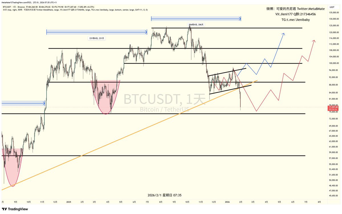 怕什么来什么,昨天还在担心周末会不会延续下跌,而且周末下跌因为流动性更低所以产生的影响会更大,果然还是发生了,虽然今天不开盘,但 $BTC 发生大幅下跌的时候还是从美国时区开始,而且也正好就是平常美股开盘的时间开始下跌的,说明这一波的抛售主要是美国投资者为主。 应该是先清算了美股,贵金属然后担心周一继续下跌,所以周末的时候对有流动性的资产开始抛售,如果真的是这样的话,相当于周末提前跌出了下周的分量,今天最低的时候已经跌破了 $MSTR 成本的 76,000 美元,不过目前还没有跌破 mNAV ,跌破的话也就可以考虑了。 一般来说如果不是因为基本面发生的改变,很有可能周一流动性回复的话会出现反弹。我并不确定会发生,但我自己是抄底了,这个价格对我还是有吸引力的,如果跌破了 70,000 美元我就继续买,今天还在和小伙伴说美国 ETF 的 Bitcoin 平均成本大概就是 70,000 美元左右,而且跌破 70,000 美元的话不少矿工也要关机了。 回到 Bitcoin 的数据来看,价格跌的挺厉害的,换手率也挺高的,尤其是这么多大换手很可能都是从美国交易时区才开始的,现在还不知道早晨亚洲投资者是什么态度,如果亚洲投资者也恐慌一轮的话,可能又是一大笔清算了,重点还是要看周一。 最近一年涨上来以后的最低端就是 4月7日 的 74,400 美元,先看看这个价格会不会破吧,但从筹码结构来看目前还是较为稳妥,并未出现多数投资者的恐慌,实际抛售的都是短期投资者。 @bitget VIP,费率更低,福利更狠