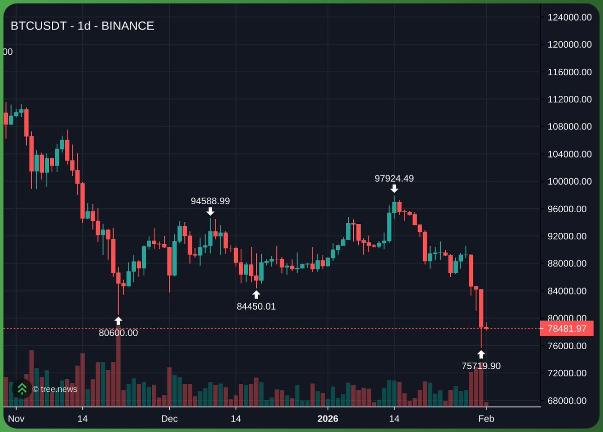 MicroStrategy's, $MSTR, full Bitcoin position turned red when Bitcoin was below $76,000 today, per Bloomberg
