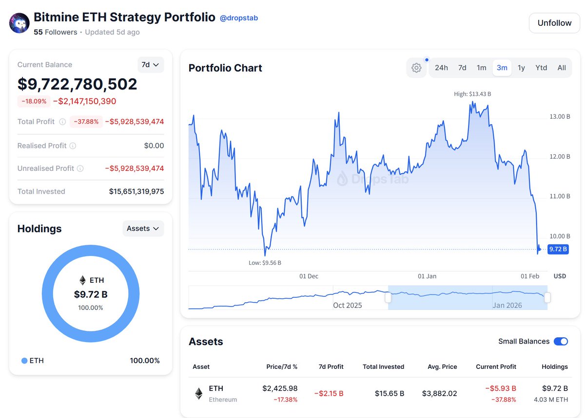 比起微策略 @MicroStrategy 刚刚触及成本线 $76K, $BMNR @BitMNR 的处境,明显要更惨一点。 随着 $ETH 回落至 $2,400 ,BitMine 手里的 400 万枚 $ETH 已经浮亏近 $60 亿美元, 其成本价 $3,882,想回本得涨 60%。 看来BitMine的CEO Tom @fundstrat ,要比易立华 @Jackyi_ld 先送外卖了。