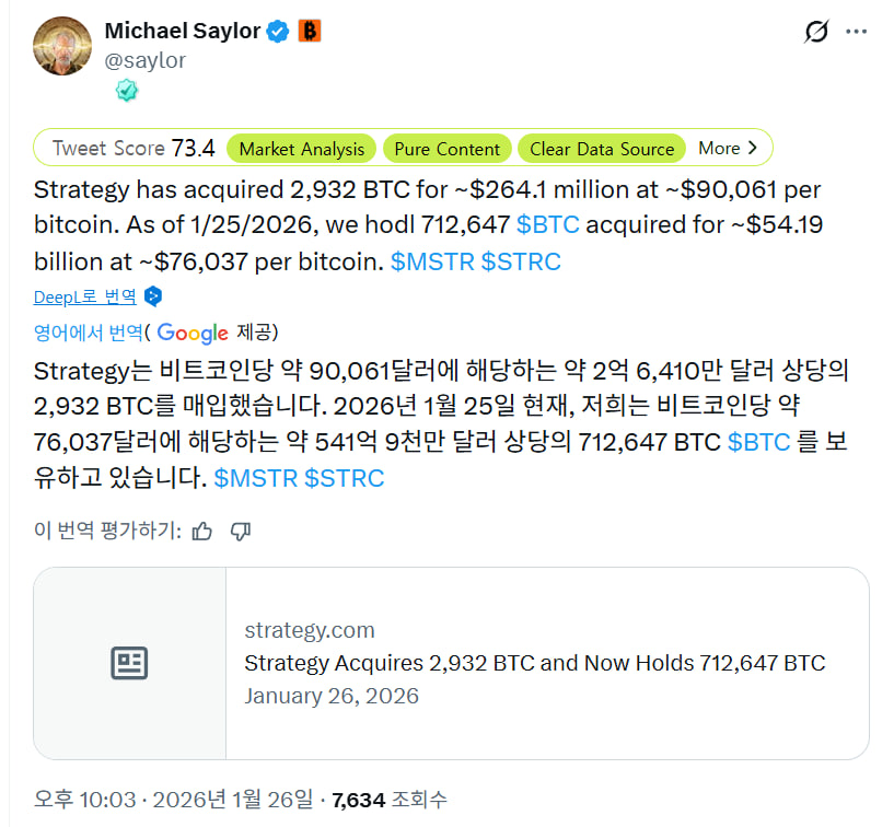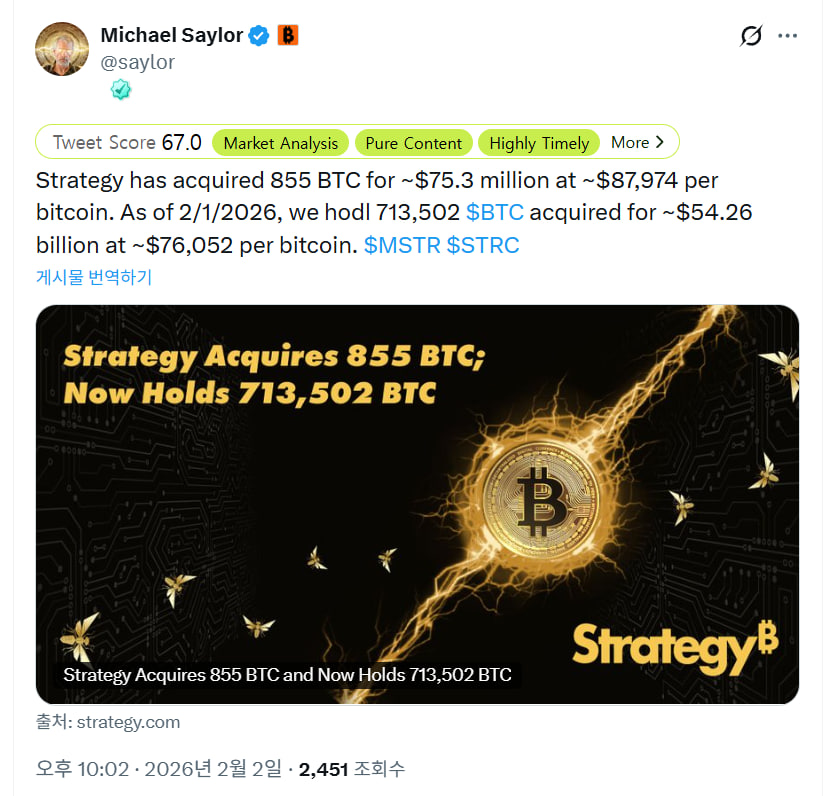 세일러 스트래티지 비트코인 추가 매수 @saylor - 이번 매수 : 855 $BTC * 평단 $87,974 - 총 물량 : 713,502 $BTC * 평단 $76,052