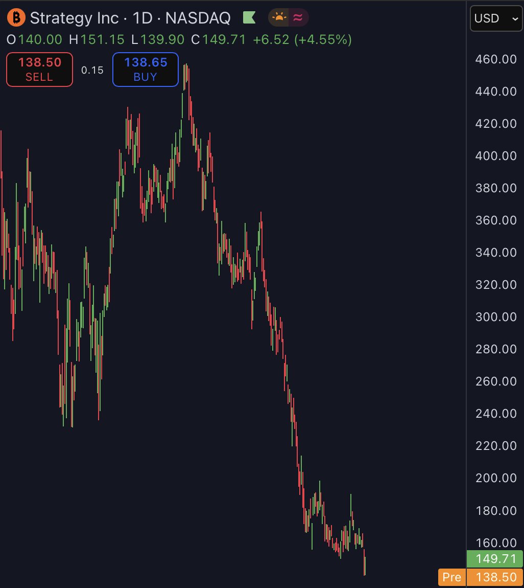 💥BREAKING: Michael Saylor’s Strategy $MSTR is down 8% in pre-market trading and down 70% since the summer 2025 high.