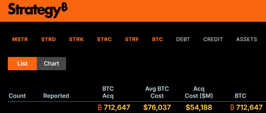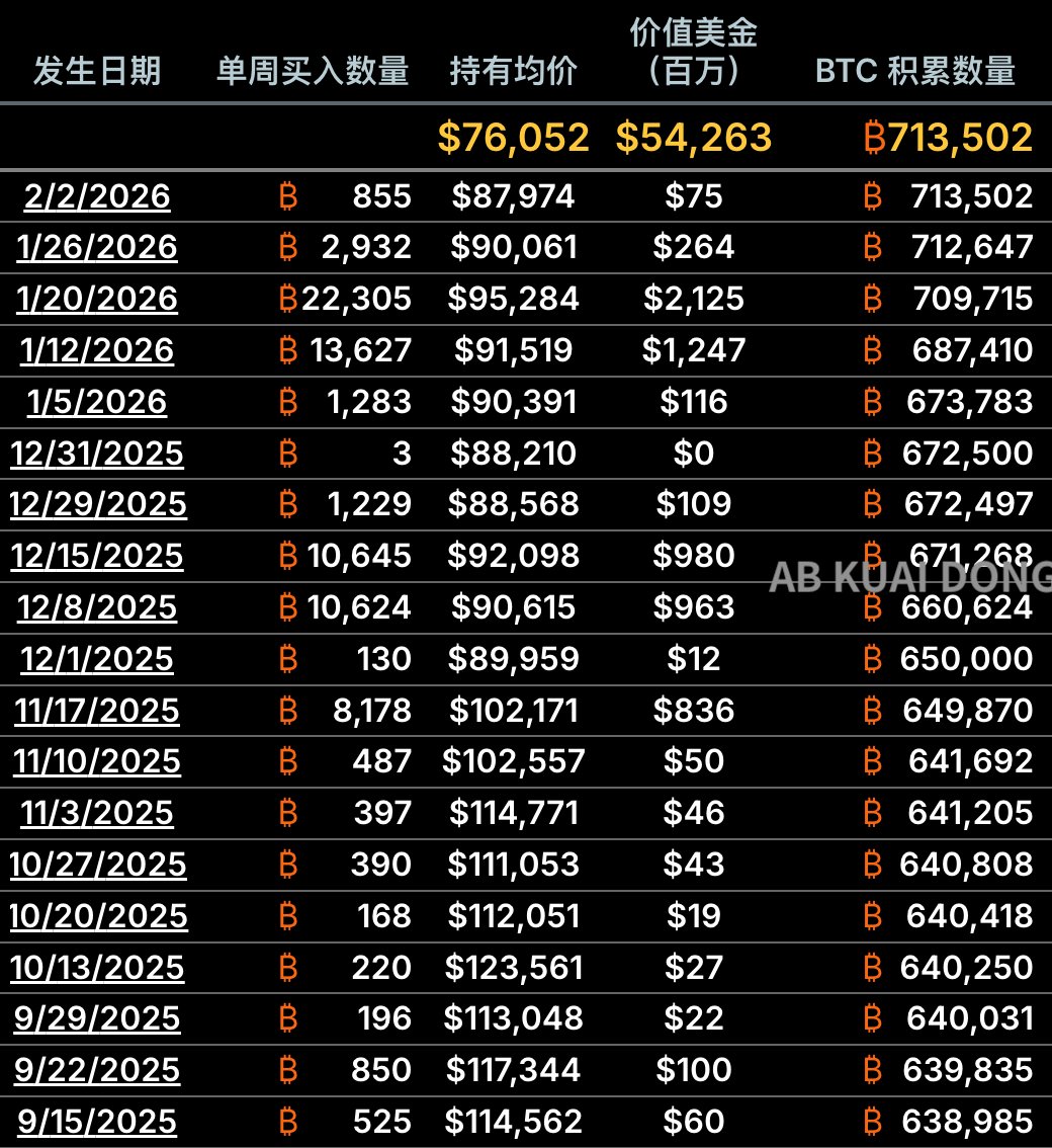 $MSTR 又买入了 855 枚 $BTC ,总花费 7,530 万美元,平均单价 87,974 美元,截止到目前 MSTR 共持有 713,502 枚 BTC,总成本约 542.6 亿美元,平均成本 76,052 美元,当前 Bitcoin 的价格为 79,000 美元,MSTR 仍处于盈利状态。