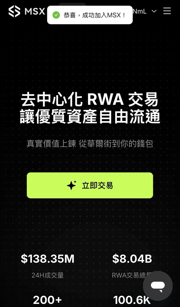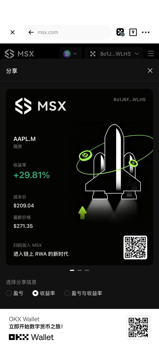 币圈最近走势欠佳 但如果真的进入熊市 把视野拉长 研究美股、熟悉 RWA 大概会是下一轮能赚钱的方向 MSX 现在就是那种蓄势待发的感觉 哪天 RWA 板块被点燃 平台币的想象空间将直接拉满 这几天走表姐链接刷 M 豆的地址 我都调到最高返佣了 :
