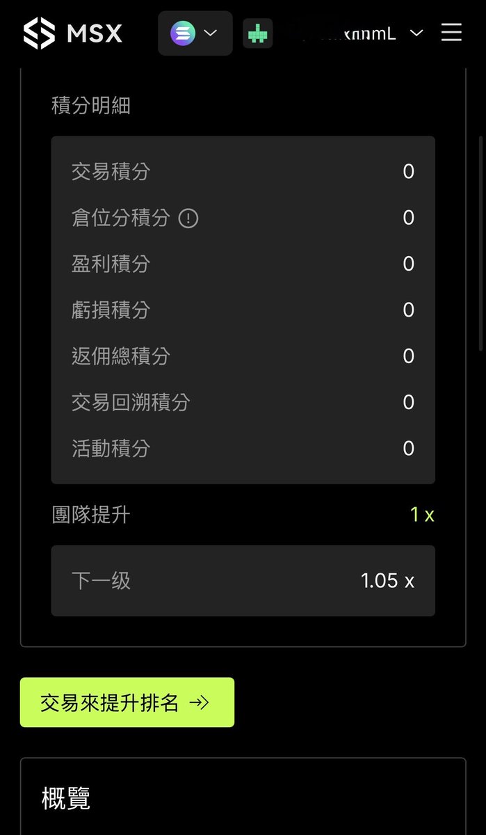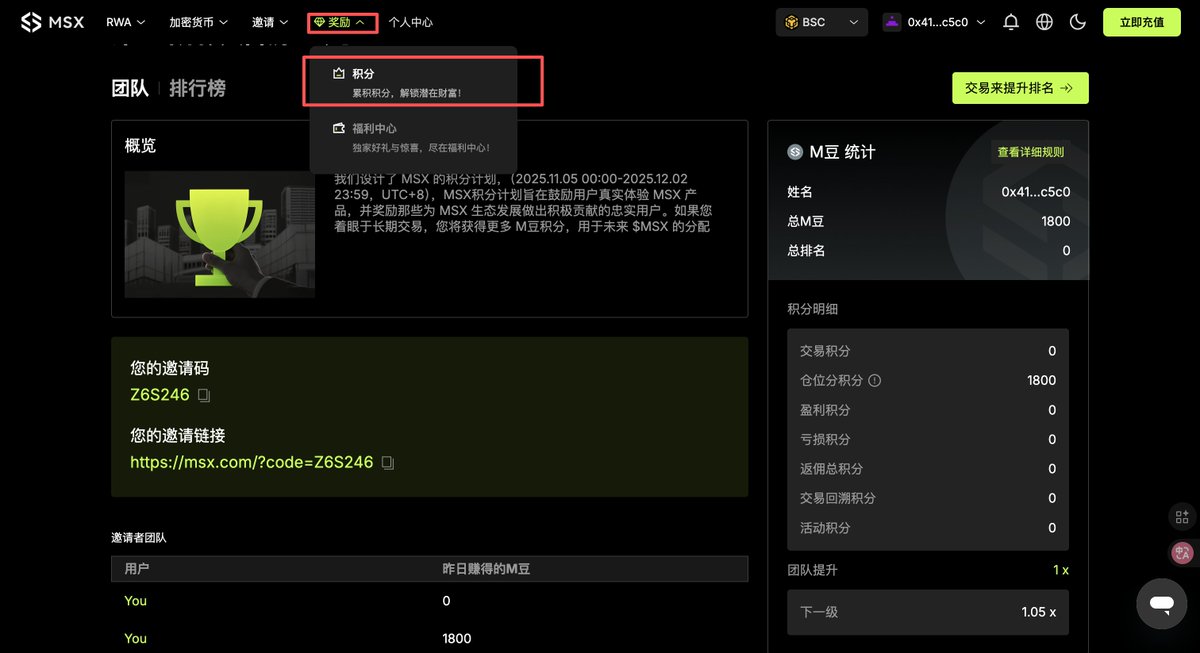 大家久等了🤩期待已久的@MSX_CN 麦通 MSX S1 积分赛季 正式上线 整理出积分赛的重点,本文有些长,手把手跟你们说玩法 1.活动时间:2025.11.05 00:00 - 2025.12.02 23:59,UTC+8 2.评分方式: 第 1 阶段的 MSX 积分称为: (M豆) 3.评分考虑以下因素: M豆= (交易量 + 仓位分+盈利积分+亏损积分 ) * 团队 Boost 加成 + 推荐佣金积分 🔺交易量交易量越大,M豆越多 • 仓位分=仓位价值*持仓时间 持仓时间越长,仓位分越高 • 每日实现的盈亏(不含资金费用等)计入 M豆。 • 积分明细:交易积分、仓位分积分、盈利积分、亏损积分、返佣总积分、交易回溯积分、活动积分。 • 推荐积分与团队积分: 推荐积分: 第一级受邀者获得10%,第二级受邀者获得 5%。包括交易量得分、仓位分得分、盈利得分、亏损得分。 团队积分: 团队提升每日重新计算,隔日积分反映前一日的提升。 个人 M 积分每日结算,并于次日 10:00(UTC+8)更新。团队积分则于第三日 10:00(UTC+8)更新 🔺用户参与细则: 1.仅对美股现货和永续合约中的交易累积。 2.积分由交易量、持仓分数、盈亏表现和团队 Boost 级别共同决定。 3.积分获得可因持有期限、盈利能力或团队级别而有所不同。 4.只有符合所有要求的用户才被视为合格的参与者。 5.每位用户仅能获得一次 M 信用;机器人账号和持有时间过短等异常行为不符合奖励资格。 6.MSX 保留取消因洗盘交易、市场操纵、大量账号注册以获得额外奖金或任何其他欺诈行为而产生的积分的权 利。 7.历史交易将由系统自动计算和分配;具体规则将另行公告。 点击连结即可开始🔽 https://t.co/rRNTNE25gJ 具体步骤如下: 图1.连结钱包 图2.成功连上会出现「成功加入MSX」 图3.点选钱包地址进入安全中心, 进行邮箱验证 图4.右上角三条-进驻,即可看见团队与积分内容 麦通积分赛不只是拼交易量,更像是一场策略与团队的博弈,有操作、有节奏、有信任 不管你是想验证自己的节奏,想带队冲榜,都希望你能找到适合自己的步伐,赚得盆满钵满 #麦通 #美股 #链上美股 #RWA