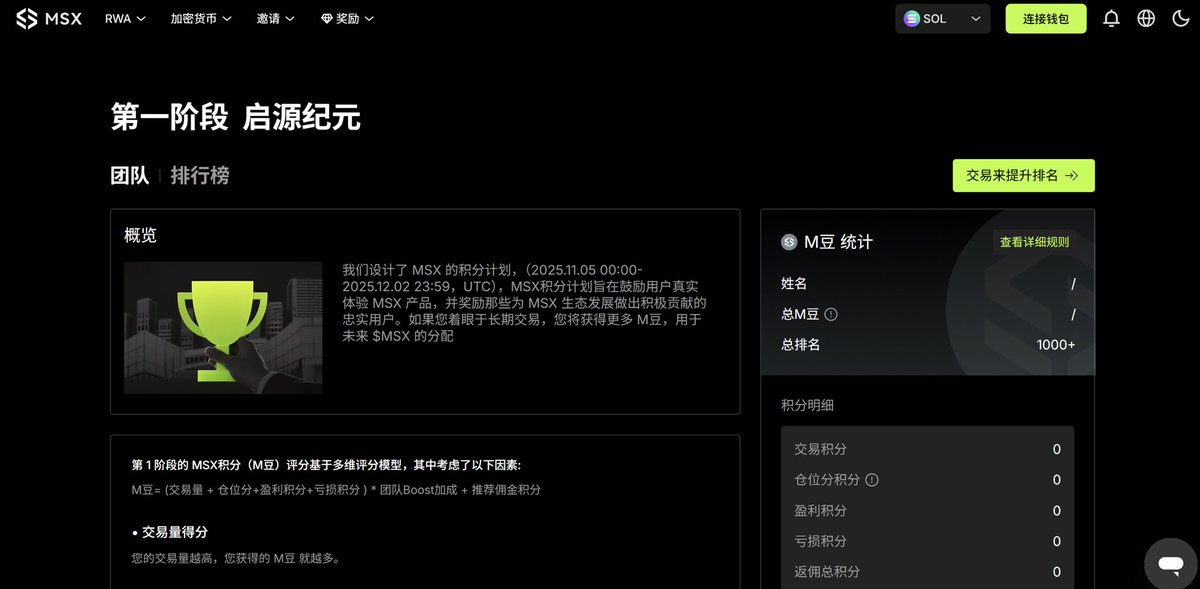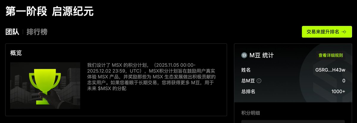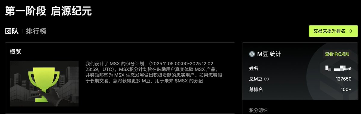 千呼万唤 终于MSX 积分赛季 S1 开盘! 天上掉馅饼也得张嘴 这是第一波 不废话,一文玩转 S1 攻略 📅 时间:2025.11.05 - 2025.12.02(UTC+8) 👊 什么是 S1? 在 MSX 上,每一次真实交易、每一个持仓、每一笔盈利,都在累积你的 M豆 —— 未来 $MSX 的原始筹码 交易量越大、仓位越稳、P&L 越狠、团队越强,你的分就越高 每天 10:00(UTC+8)系统结算,公开透明 真做交易的人,永远不会被埋没 🔥 新手三步上车 1. 注册 & 入金 https://t.co/owpGNKUpx8 KYC 非常简单,秒过,美股现货、币币合约随便玩 2. 开干交易 每天交易、持仓、盈利,全都算分 不拼表象,拼实绩 3. 拉团队,开Boost 一个人玩积分是加法,组队是乘法 团队活跃越高,Boost 越猛,积分翻倍起飞 目前我的队伍已经240人 🧠 怎么才高效? 交易量:打量就是底气 仓位:稳持RWA,积稳分 盈利:有Alpha就有奖励 社交:推荐+团队,倍数加成 短线冲榜、长线持仓、拉队博弈, 玩法自己定,但规则透明。 💣 RWA × 积分 = 双重 Alpha 市场不确定,但积分是确定性收益 这才是玩家和平台共同博弈的最高级形态 🧩 老用户别慌,历史全算 MSX 会自动回溯老用户数据, 你之前的每一笔真实交易,都会被认领进系统 不用申领,系统自动发放 贡献过的,都会被看到 ⚡ 为什么现在就要干? 这是 S1,首季启动 M豆从 0 开始,早期筹码 = 最早最低成本的机会 你现在的交易量、团队规模、活跃度, 都会直接映射未来 $MSX 分配 时机,时机,还TMD是时机 别错过第一波机会 你就 正常交易 白赚积分=白获得未来平台币 MSX 分配 🔗 入口:https://t.co/owpGNKUpx8