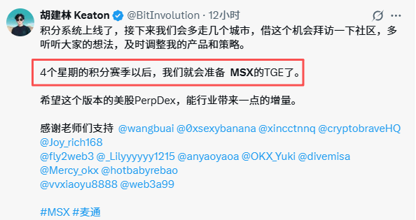 🎈2023年11月,比特币铭文叙事造富了一波人; 2024年11月,meme season又造富了一波人; 2025年perpdex和美股RWA再次创造了巨量的财富效应; 而占据perpdex以及美股代币化核心叙事生态位的平台,目前只有MSX。 📌看了下目前MSX S1的积分赛机制: (1)根据在美股现货、美股合约、币币合约的交易量计算; (2)根据持仓金额计算; (3)根据你的盈亏比来计算; (4)通过邀请拉新或者团队的Boost计算积分; 总体而言,是从交易量、持仓(仓位 / 时间 / 盈亏)、团队活动以及拉新这四个维度衡量。 这样的机制也是最大程度奖励“真实用户”,而不是依靠刷量机器人的工作室。官方也明确说明了会做防女巫。这个赛季从 11 月 5 日 正式开启,持续到 12 月 2 日,而每年临近圣诞节美股都会有一波行情。 错过了3u的bnb、错过Hyperliquid、错过了ASTER空投。现在又有一个龙头项目在你面前,那么你的选择是? 活动链接:https://t.co/MSTL3JHDOg