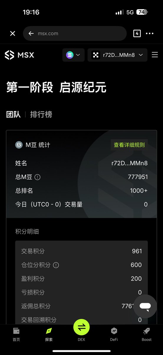 玩了几天 MSX 积分赛季 S1, 发现大多数人都在疯狂刷交易量 但真正拿高分的人,在研究积分模型 交易量不是越多越好,是越集中越值钱。 很多人一天刷几十笔小单,分涨得慢。 我后来改变打法—— 挑两三支波动大的 RWA 美股,比如 TSLA.M 或 NVDA.M, 一口气下够仓,做完波段隔天再动。 仓位别急着平 你买一笔 2 万U 的美股代币, 就算不动,系统每天都会算仓位价值。 持得越久,分越多 每天 10 点后台结算积分, 当天赚的,会加分; 当天亏的,再大仓也白搭。 我现在的节奏是: 盈利日留核心仓,让系统算加成; 亏损日果断清 团队 Boost,不在乎拉多少没交易的用户 在于能有多少活跃用户 很多人只顾邀请,不看后续。 Boost 倍数其实看团队的活跃度 我刚开始拉了十几个号, 结果真在玩的没几个,Boost几乎没加。