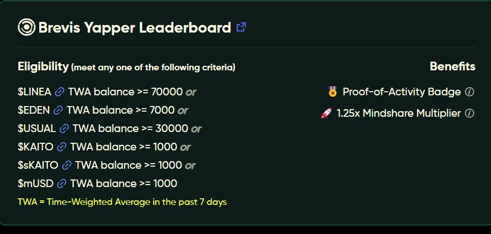 Brevis Yapper 第二季开动了。持有 $LINEA 、 $EDEN 、 $USUAL 、 $KAITO 、 $mUSD 指定数量的币可以获得1.25X系数加成。无言在排名上有了更多的优势。就这样赋能Linea 还是拉不动!